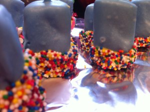 4- If you want to you can double dip the marshmallow treat. You can also dip the marshmallow into sprinkles before it hardens. That’s all sorts of happy fun.