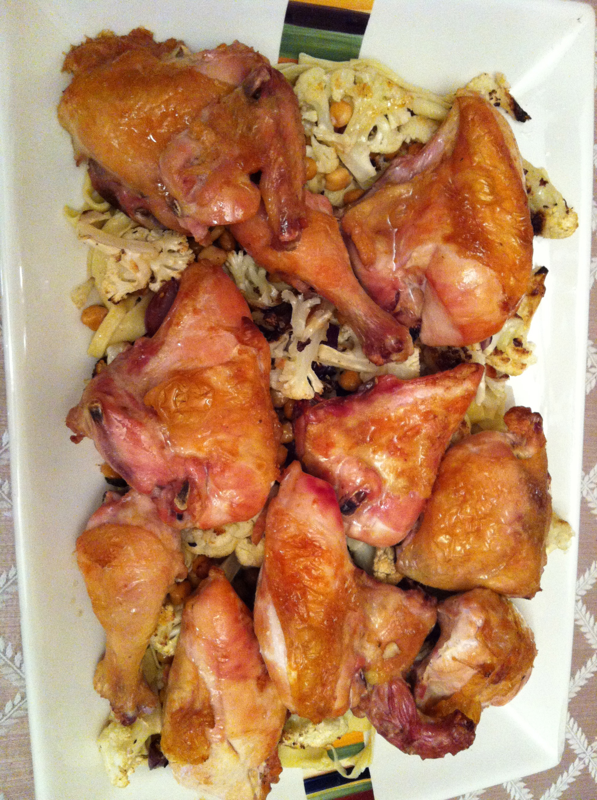 2- Remove chicken from oven and, with tongs, transfer to another rimmed baking sheet along with tomatoes. Add cauliflower, onion, and chickpeas to drippings on first sheet and toss to combine; season with salt and pepper. Roast chicken on upper rack and vegetables on middle rack until chicken is golden and cooked through and cauliflower is tender when pierced with a knife, about 30 minutes. Transfer chicken and vegetables to a serving dish and serve immediately.