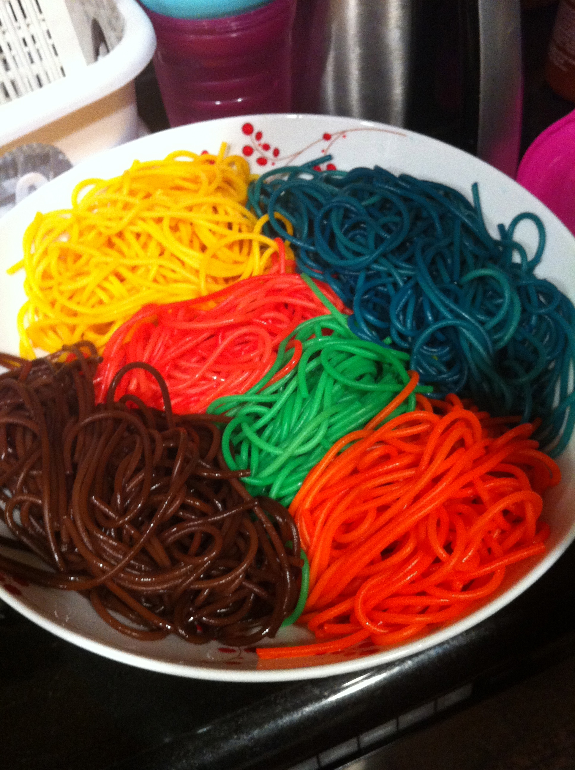 The pasta, by the way, was the BIGGEST hit at our dinner table.  E actually measured out the food coloring and tossed the pasta herself.  Oohing and Aahing each time the colored pasta emerged.  A little food coloring makes SUCH a difference in a little girl’s life!