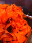 I made up the carrot salad recipe, sorta based on one I kinda remember my friend Victoria making a gazillion years ago. It had rice wine vinegar and sesame seeds and a sprinkle of sugar. I added a dash of soy sauce for salt and umami, the raisins for sweetness and the black sesame seeds – well, to be honest I can’t figure out where I put the white ones. So Be It.
