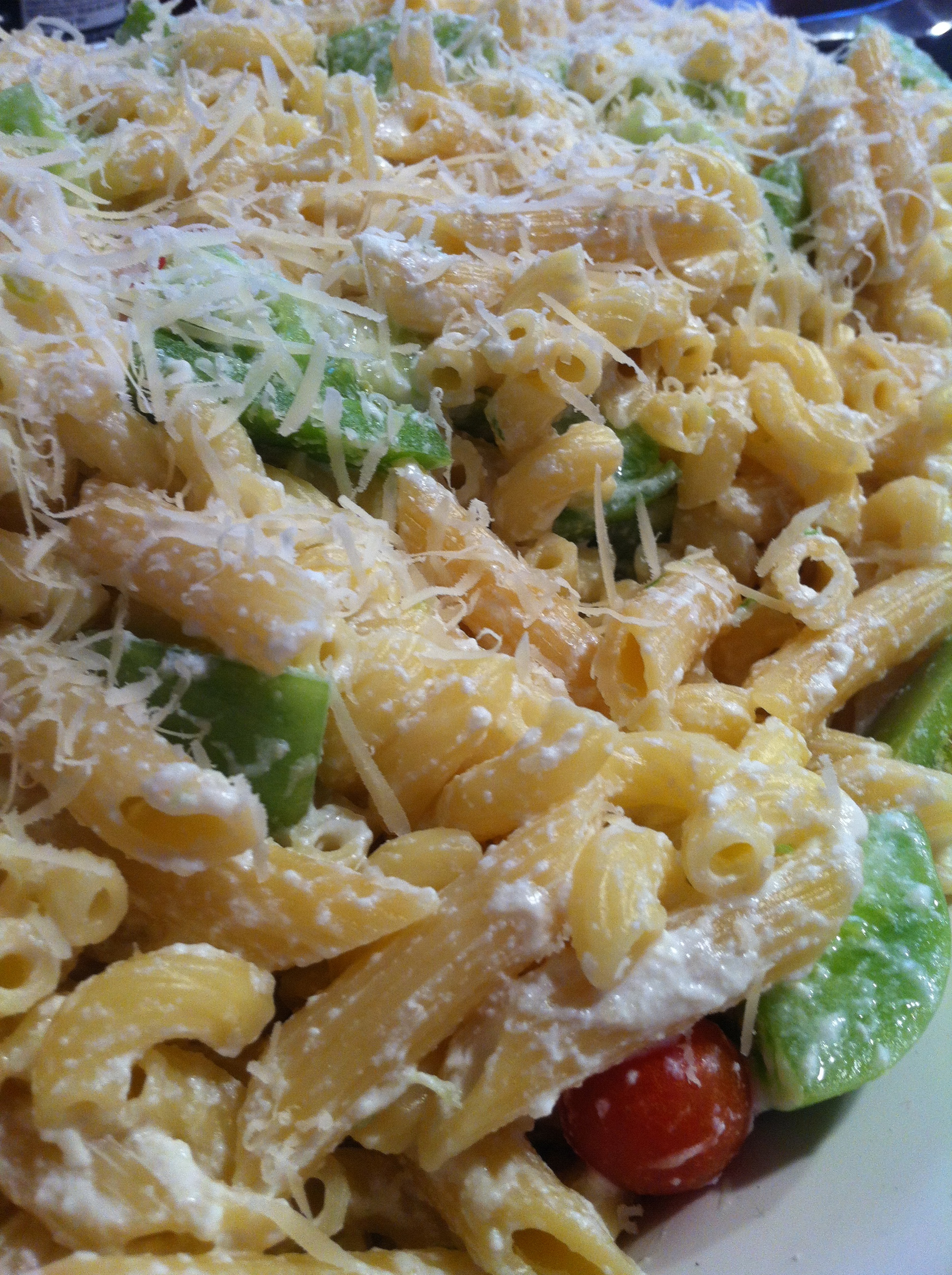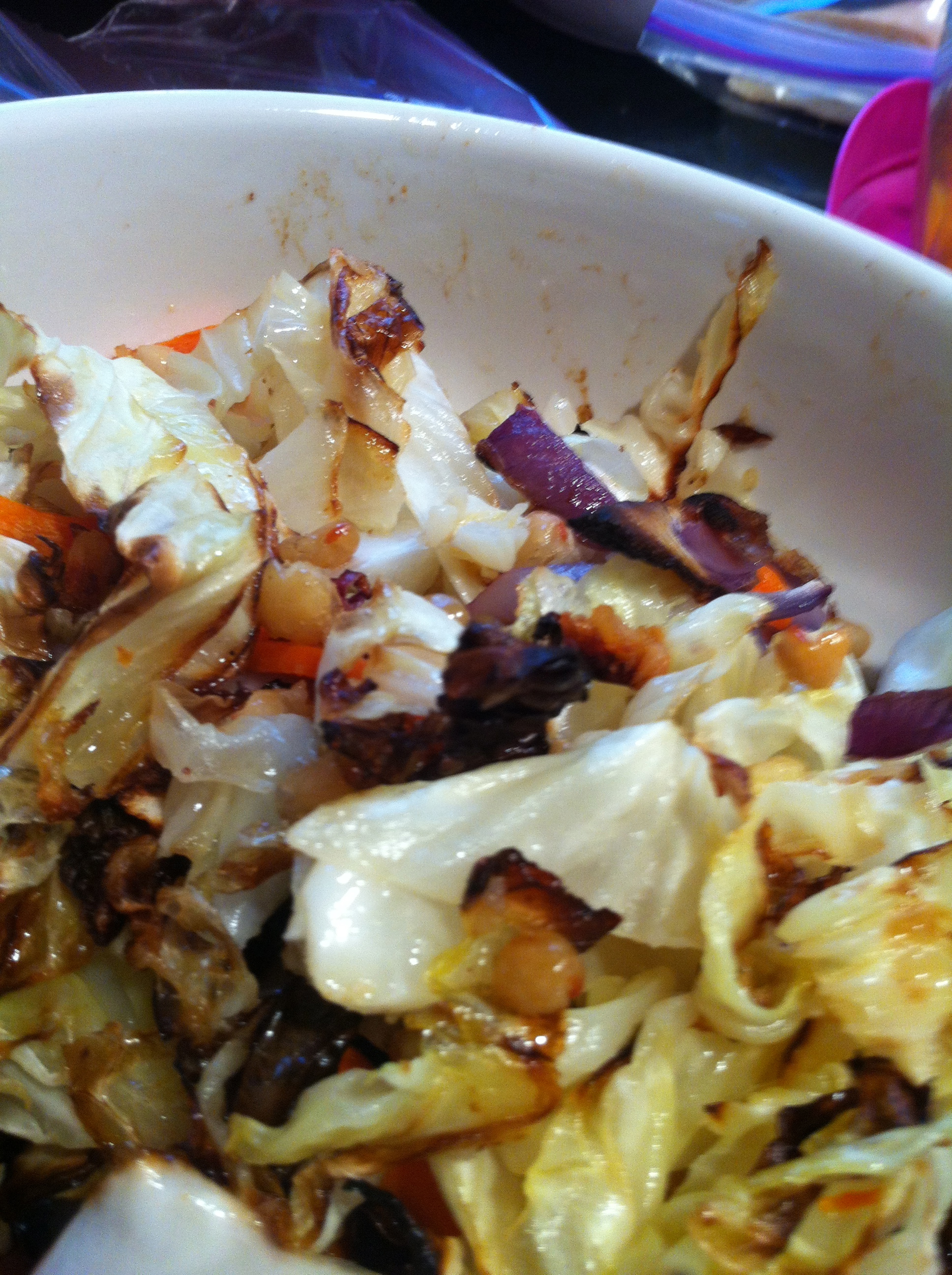 Dinner tonight was Pasta with Green Tomatoes, Ricotta, Citrus and Parmesan. Sides were a roasted vegetable salad (cabbage, carrots, red onions and white beans tossed with a little olive oil and roasted at 425 for 20min or so, then sprinkled with some celery salt) and a sweet & tangy shaved carrot salad with raisins and black sesame seeds. Oh, and there was homemade bread too. I didn’t take a picture of the bread. I thought that it was pretty, but salty. It tasted like salty chewy Italian Bread… I thought the recipe said it’d be light and crisp and delicious… *sad face*