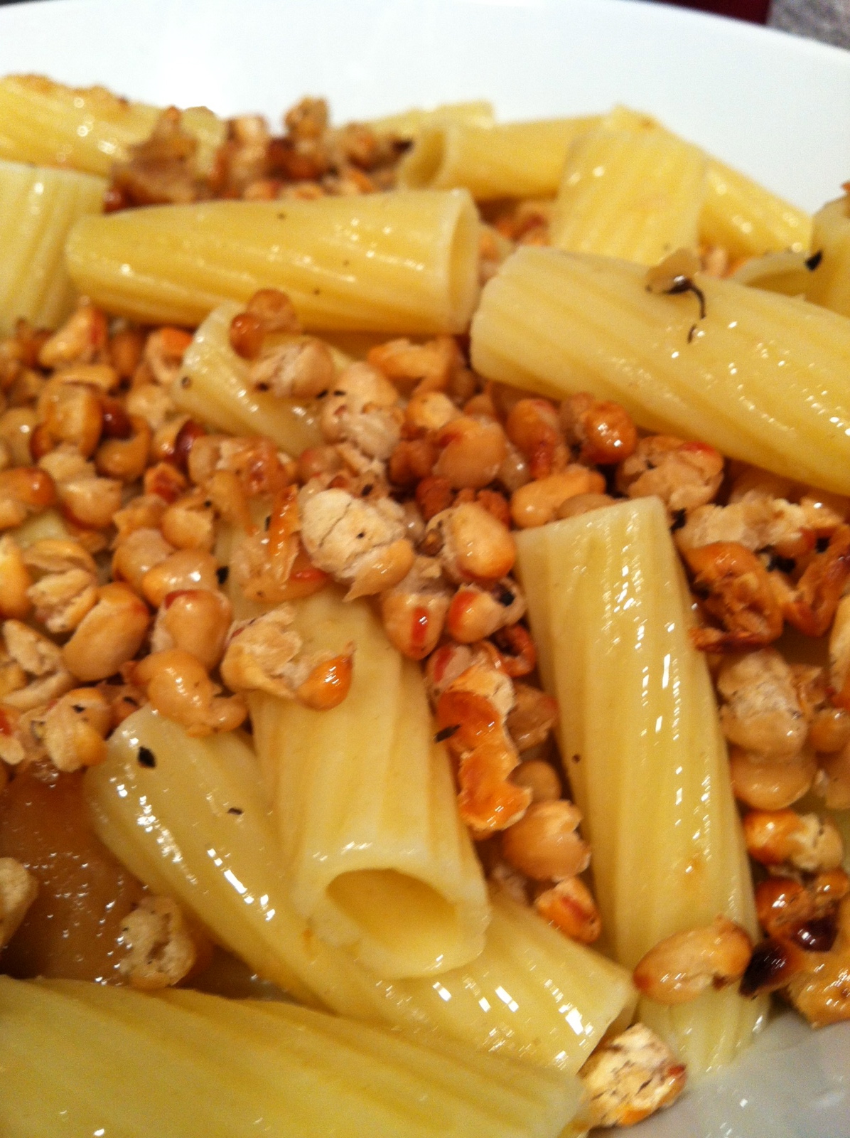 He made a box of rigatoni. While it was cooking he scooped out a few cloves of the sweet garlic from the confit’d jar, and added it along with some of the confit oil to a non-stick skillet. He mashed the cloves to release some garlicky goodness. He took a can of small white beans, drained and rinsed, and spread them out on a tray and tossed them with more oil. He roasted them on 400 for about 20 min, til they got all crunchy. He tossed the pasta, garlic + oil and the beans all together.