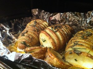 2- In a small bowl, combine butter and oil. With a sharp knife, slice potatoes very thinly crosswise – BUT NOT ALL THE WAY THROUGH. A few websites suggested laying chopsticks on either side of the potato so your knife can’t cut all the way through the potatoes. Cut carefully please.