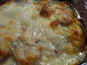 8- Using a medium sized casserole dish, you’ll layer everything thusly: cheese mix, eggplants, cheese mix, zucchini, cheese mix, eggplant, cheese mix.