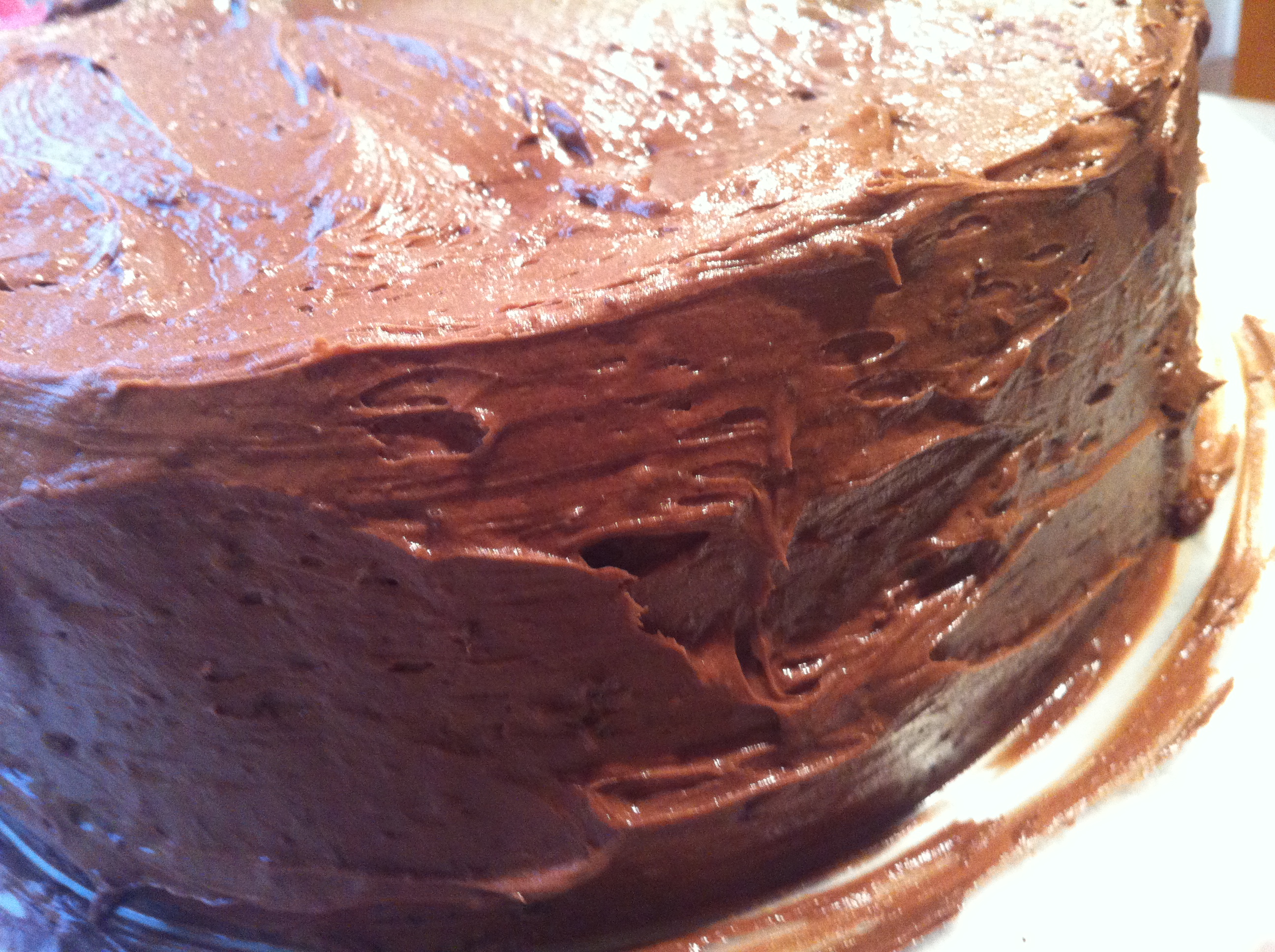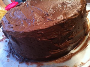 For dessert (something I don’t usually do – I am in the camp that desserts are for special occassions, not an everyday occurence) I made the Too Much Chocolate Cake recipe – which is basically any chocolate cake mix + sour cream + oil + eggs + INSTANT CHOCOLATE PUDDING + water + chocolate chips. You seriously just dump and stir this recipe then shove it into the oven for, like an hour or so. You’re supposed to let it cool before you frost it. I forgot. *sigh*