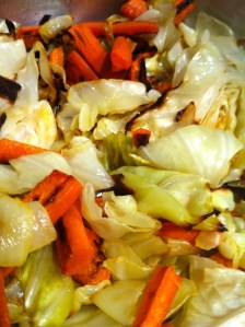 **I roasted the squash, carrots and cabbage on their own baking sheets with a little olive oil. I took the pans out after about 30 minutes, when I saw brown and crispy bits and I thought it smelled good. I tossed the veg with some salt and pepper and then scraped everything into a mixing bowl and set it aside.