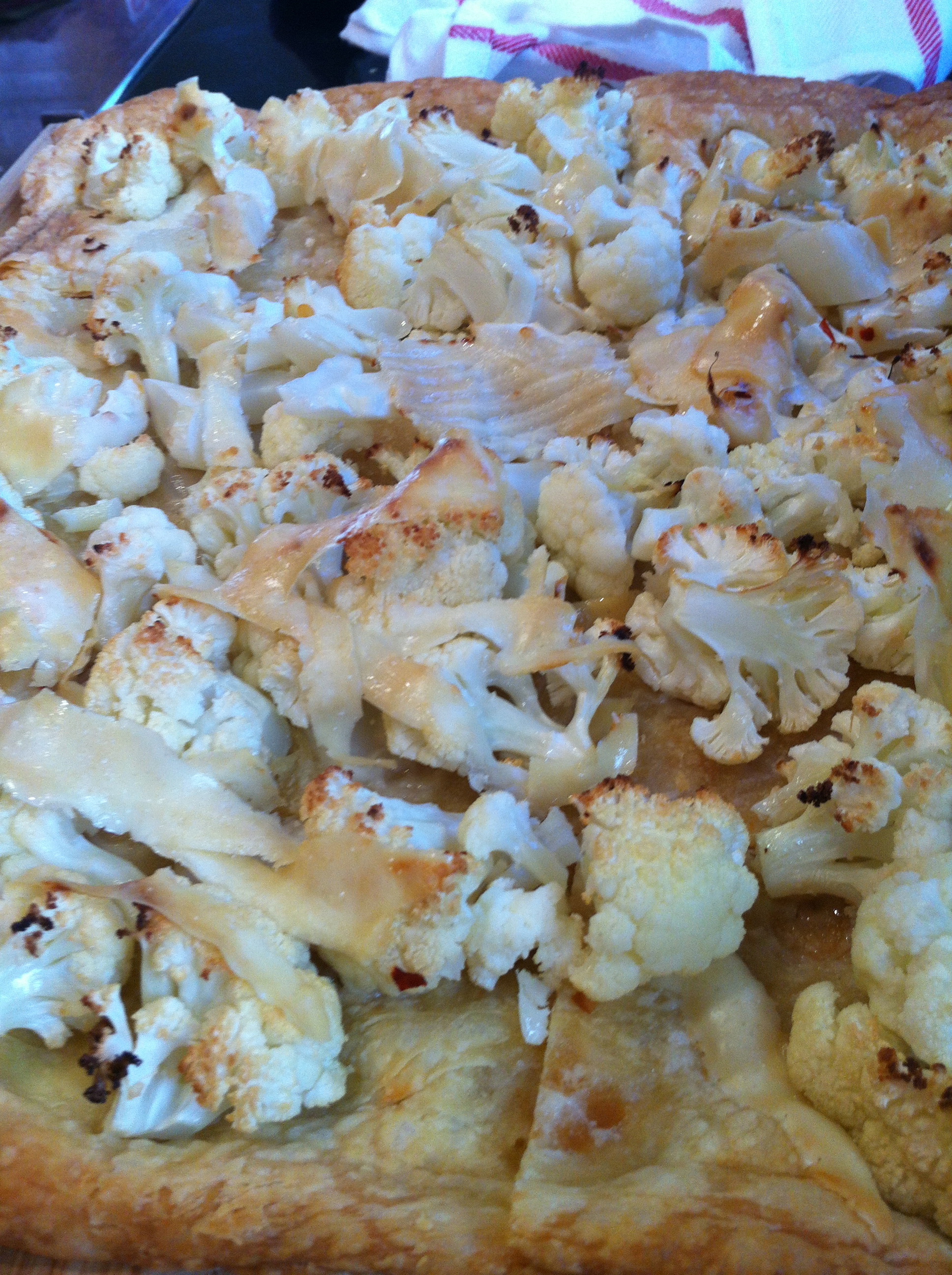 Once the puff pastry was thawed I rolled it out on top of a Silpat(I ran outta parchment paper like a week ago) and then transferred the Silpat to a baking sheet – wait, a Silpat is a silicon sheet that sits inside your baking sheets, like a reusable parchment paper. Cleans easier than scrubbing the baking sheet. You season the veg with a little garlic, olive oil, s/p and crushed red pepper flakes. You score the edge of the pastry to make a border (I also rolled the edges in a bit to make a more distinct edge to the tart) and then add the seasoned cauliflower florets, top with shaved Pecorino and pop into a hot oven for 30 minutes.