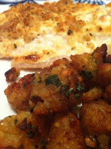Two days ago C made dinner: Homemade Salmon burgers served with Parmesan & Garlic Tater Tots. The Salmon Burgers were a fail…not sure why (Recipe from EveryDay Food). There weren’t even any substitutions! *shrugging shoulders*. The Tater Tots were inspired from something I saw on the Cooking Channel. I looked up a recipe and even though the BAG said to cook the tots at 450, I told C to follow the RECIPE and bake them at 400. Fail. Not crispy. Who wants limp tots?? *blech*