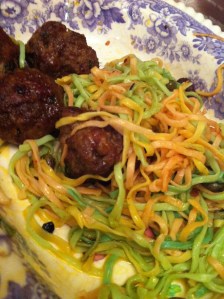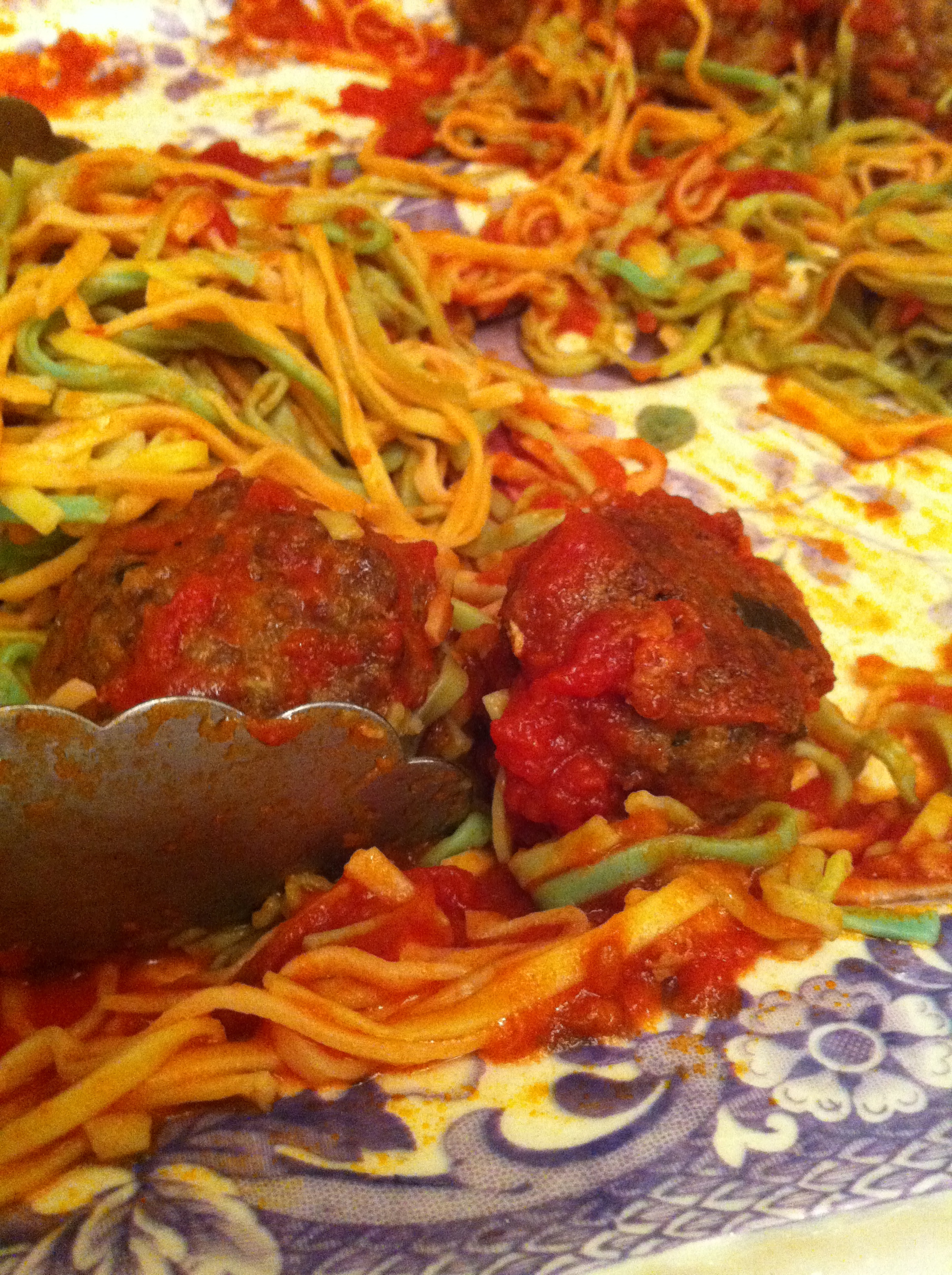My sister the Chef and her kids have been staying with us for the past few days. Last night we decided to make Pasta and Meatballs for dinner – and then E suggested we make RAINBOW pasta! After a quick discussion with all parties involved, rainbows were heartily agreed upon. Now, my sister is not a fan of traditional Spaghetti & meatballs, so we decided to make 3/4 of the pasta with a red sauce & meatballs, and the other 1/4 with Garlic Confit *clapping*.