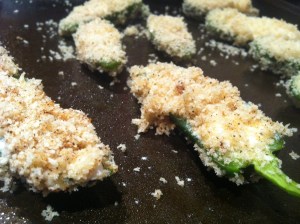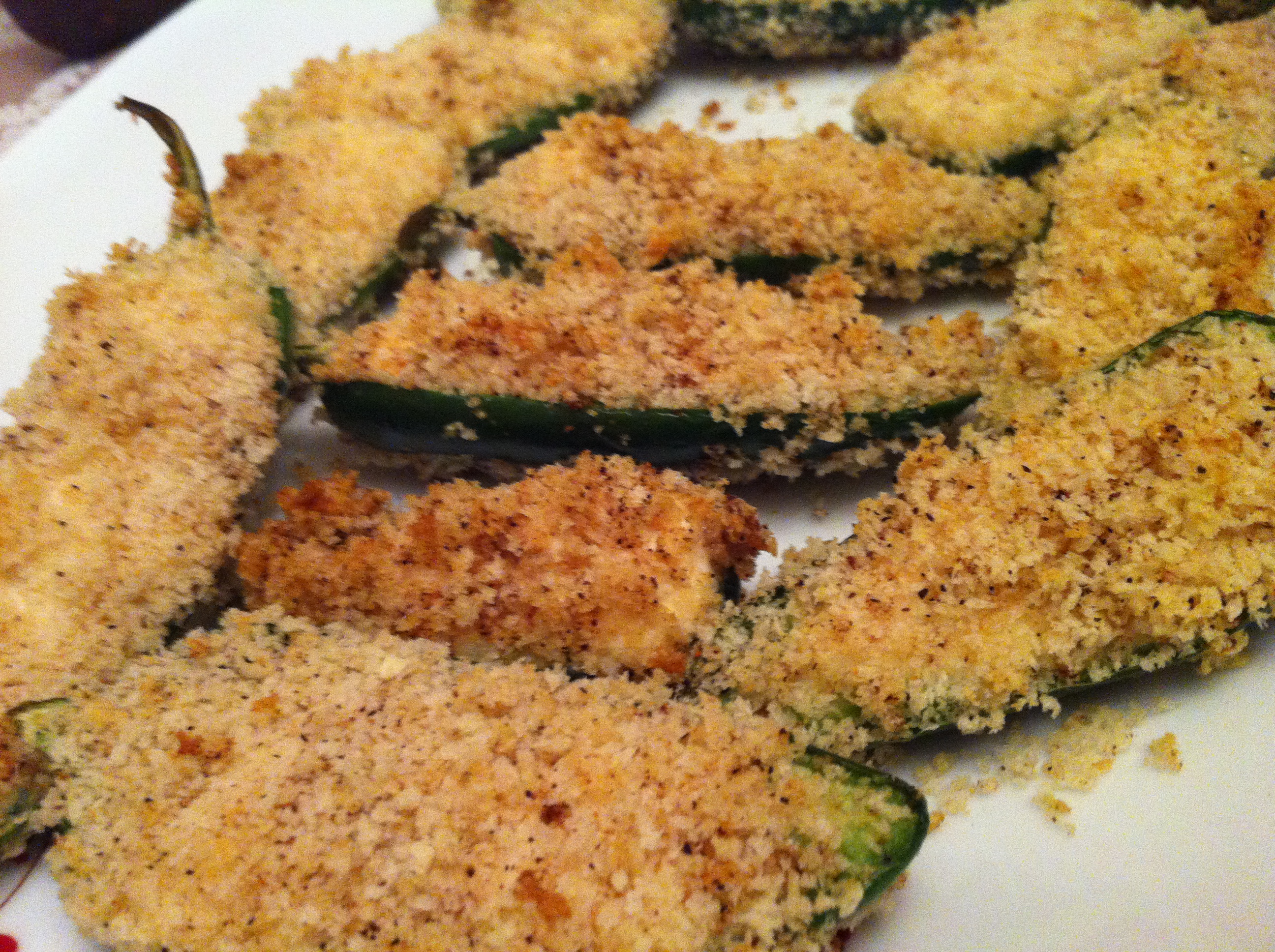 7- Dip jalapeños in egg whites and then panko mixture. Lay on lined baking sheet, piling additional crumbs atop each jalapeño. Shpritz with a little Pam and whack the pan into the oven for at least 20 minutes – til the cheese starts getting oozy. Serve!