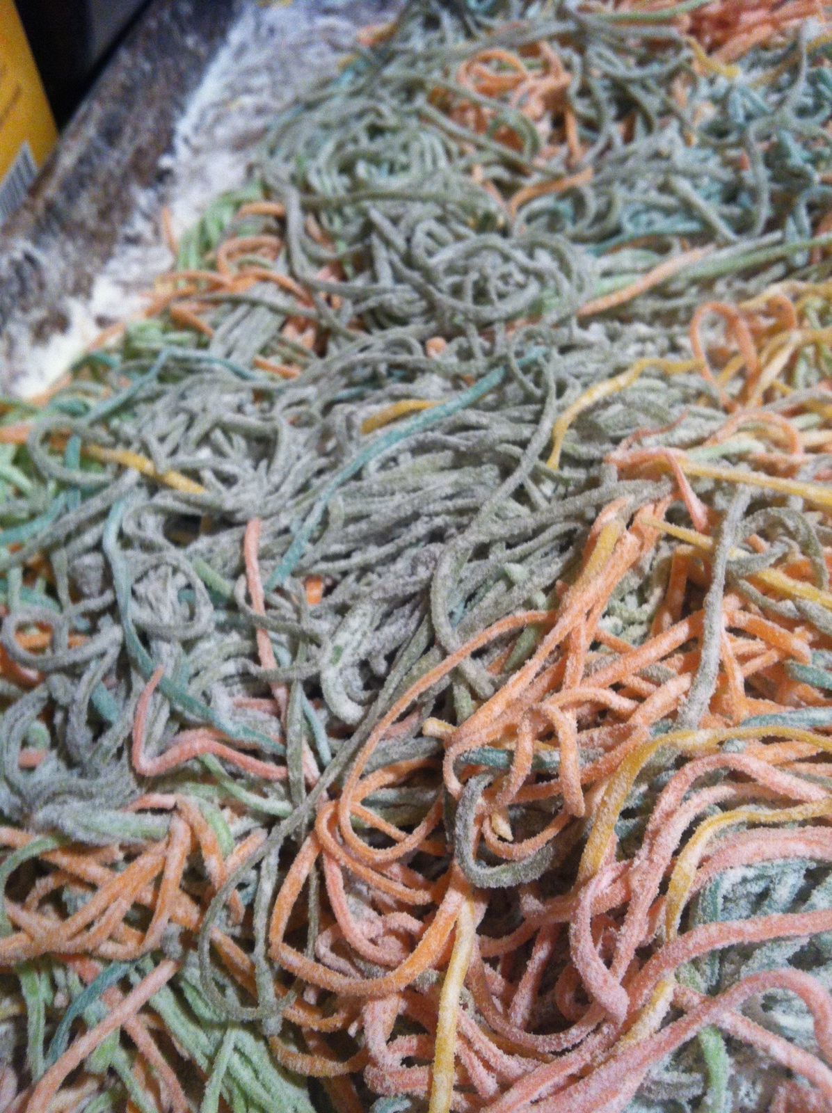 5- Then either use your linguini cutter or your knife/pizza roller to make the strands. Dust all strands with quite a bit more flour so the strands won’t stick to each other. We dumped all colors together into a single baking sheet and made sure we coated all very well with tons o’ flour.