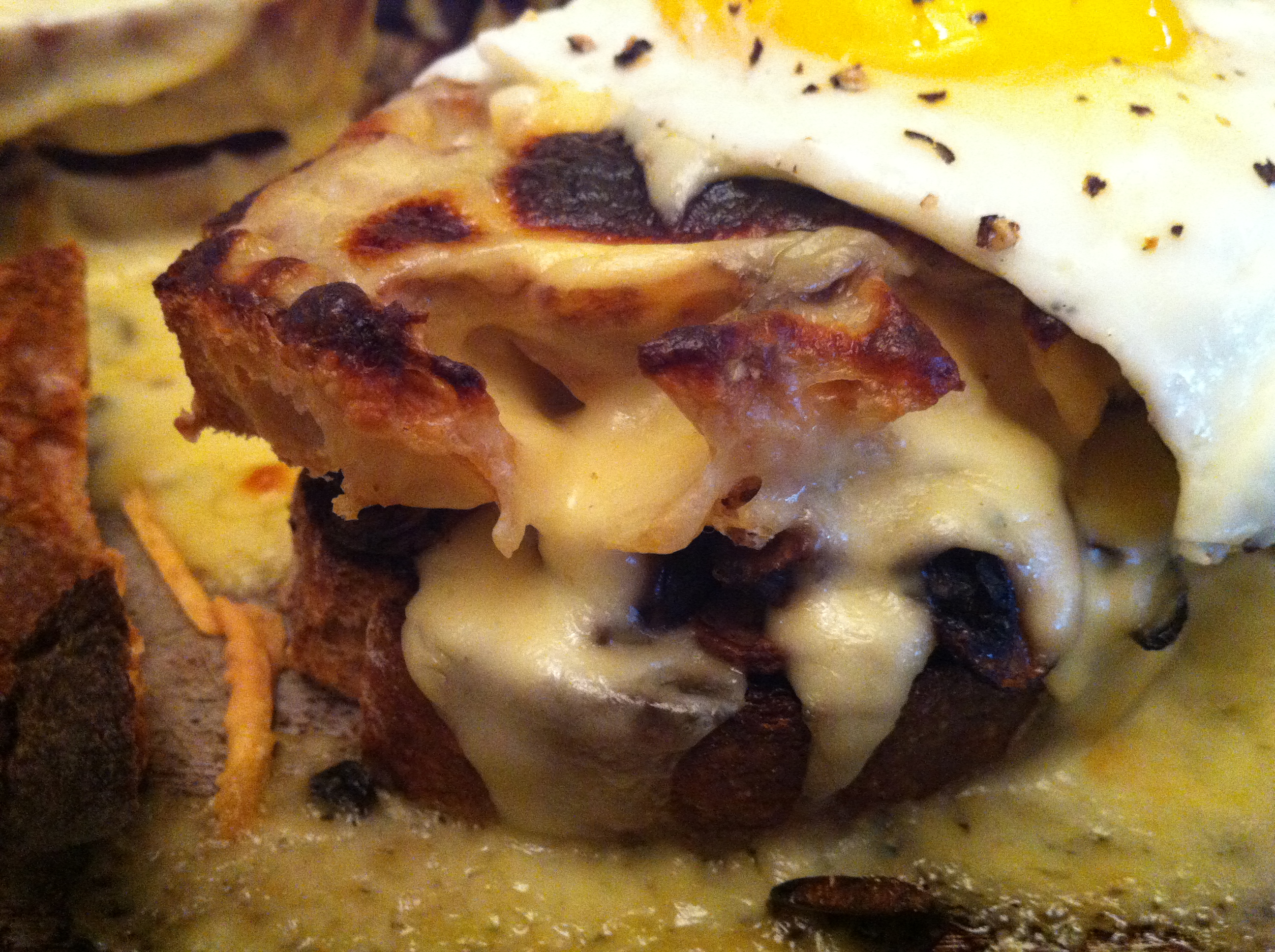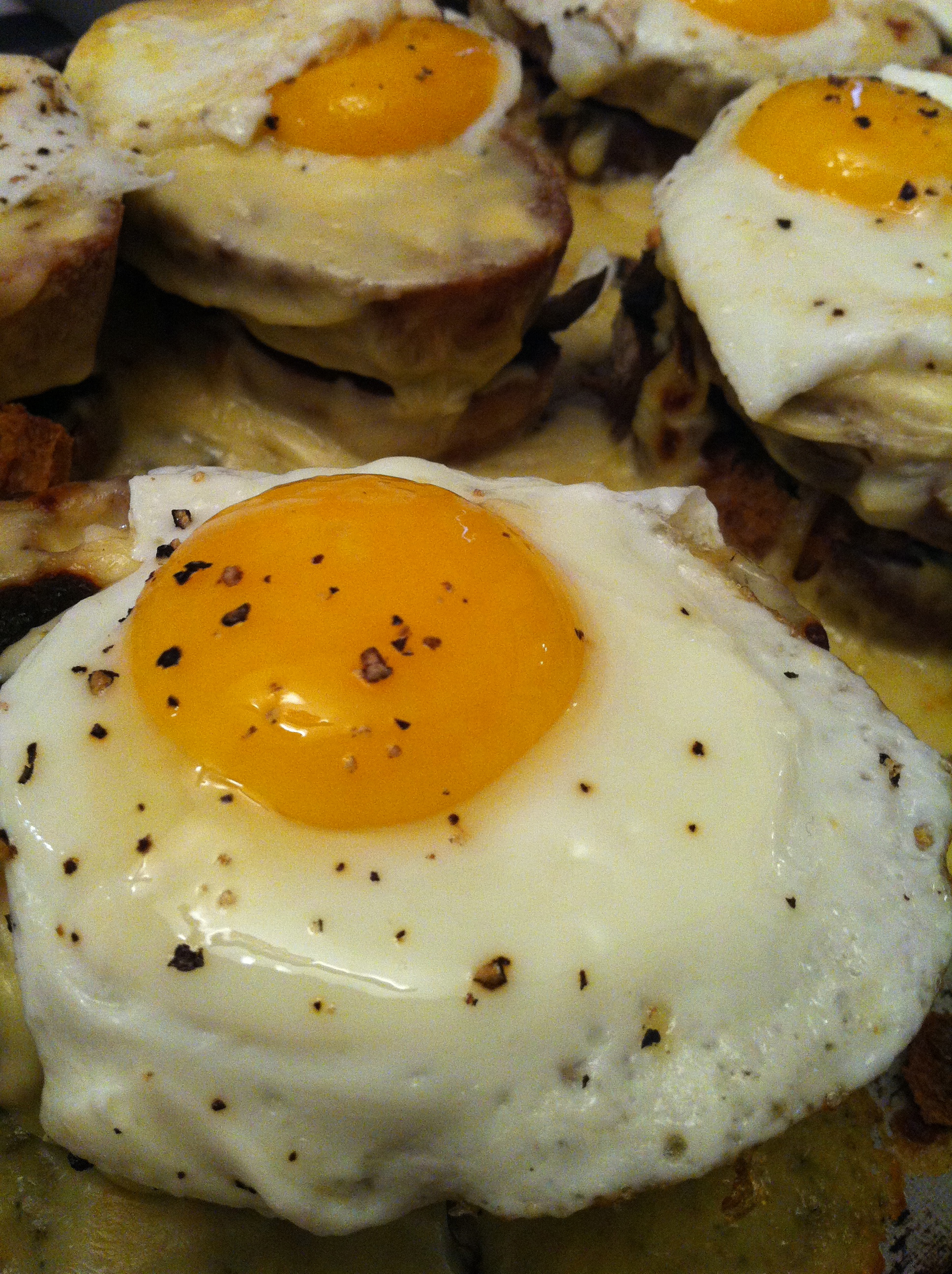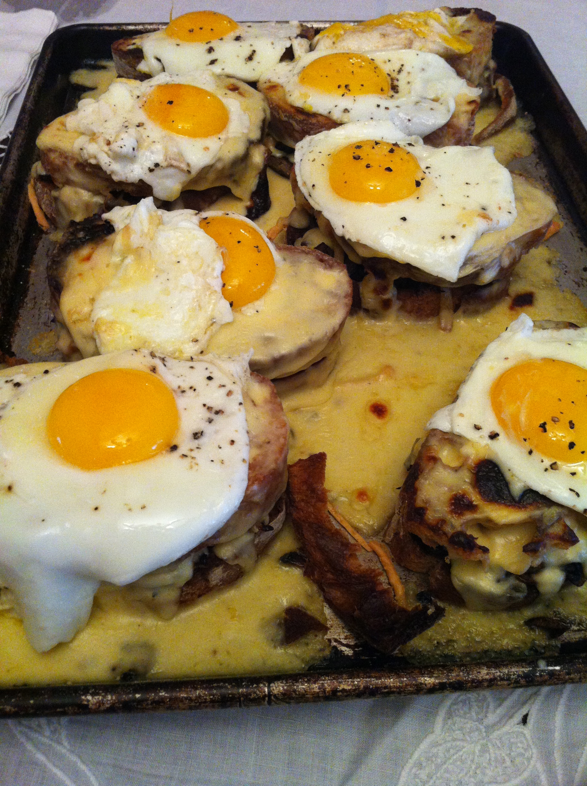 You toast thick slices of bread and you are supposed to top it with slices of ham and then grated cheese, then broil them to melt the cheese. Since we don’t eat ham, I consulted with my sister the Chef about appropriate substitutions – caramelized onions and thyme-roasted mushrooms seemed like good choices. I grated a few ounces of smoked gouda atop the mushrooms & onions. Then you broil that a few minutes til the cheese melts. You top that with toast slice #2, ladle some homemade Mornay Sauce (Bechamel + Cheese = Mornay) over the sandwich, broil that until its browned, then top everything with a sunny side up fried egg.