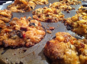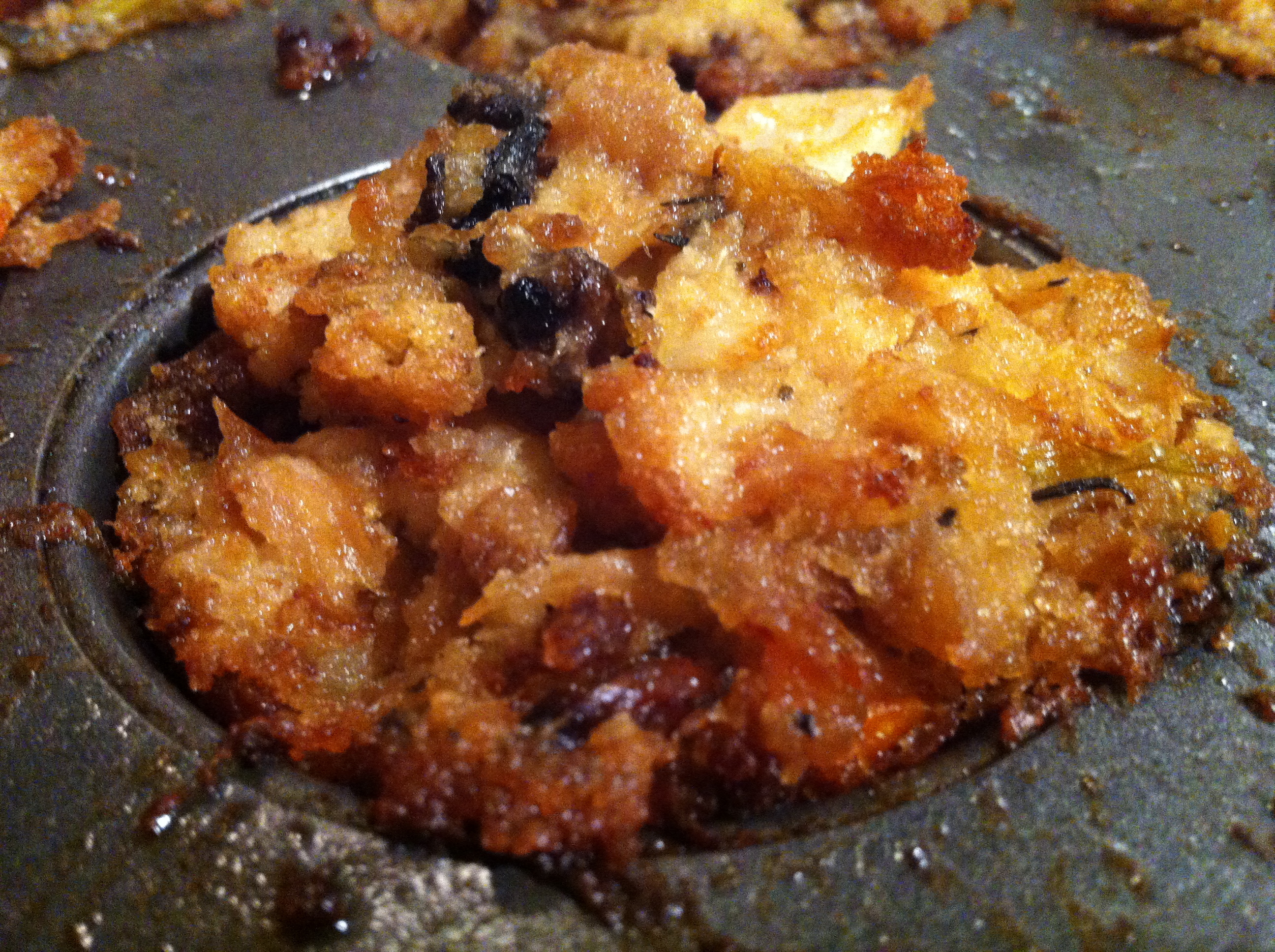 My last minute-throw-together dinner tonight was a whole mess of leftovers all mashed together in a bowl with some random additions. To the leftover stuffing and roasted cauliflower I had on hand, I added in some mayo, some oil & vinegar, the remains of one jar of Garlic Confit and then some leftover Leek Confit too, you know, for good measure. Then I mushed it together with my fingers, scooped mounds into a buttered muffin tin, shpritzed the top with a little pam to get them crispy, and whacked the pan into a 350º oven for about 40 minutes. More or less. Because screaming toddlers make you kinda lose track of time.