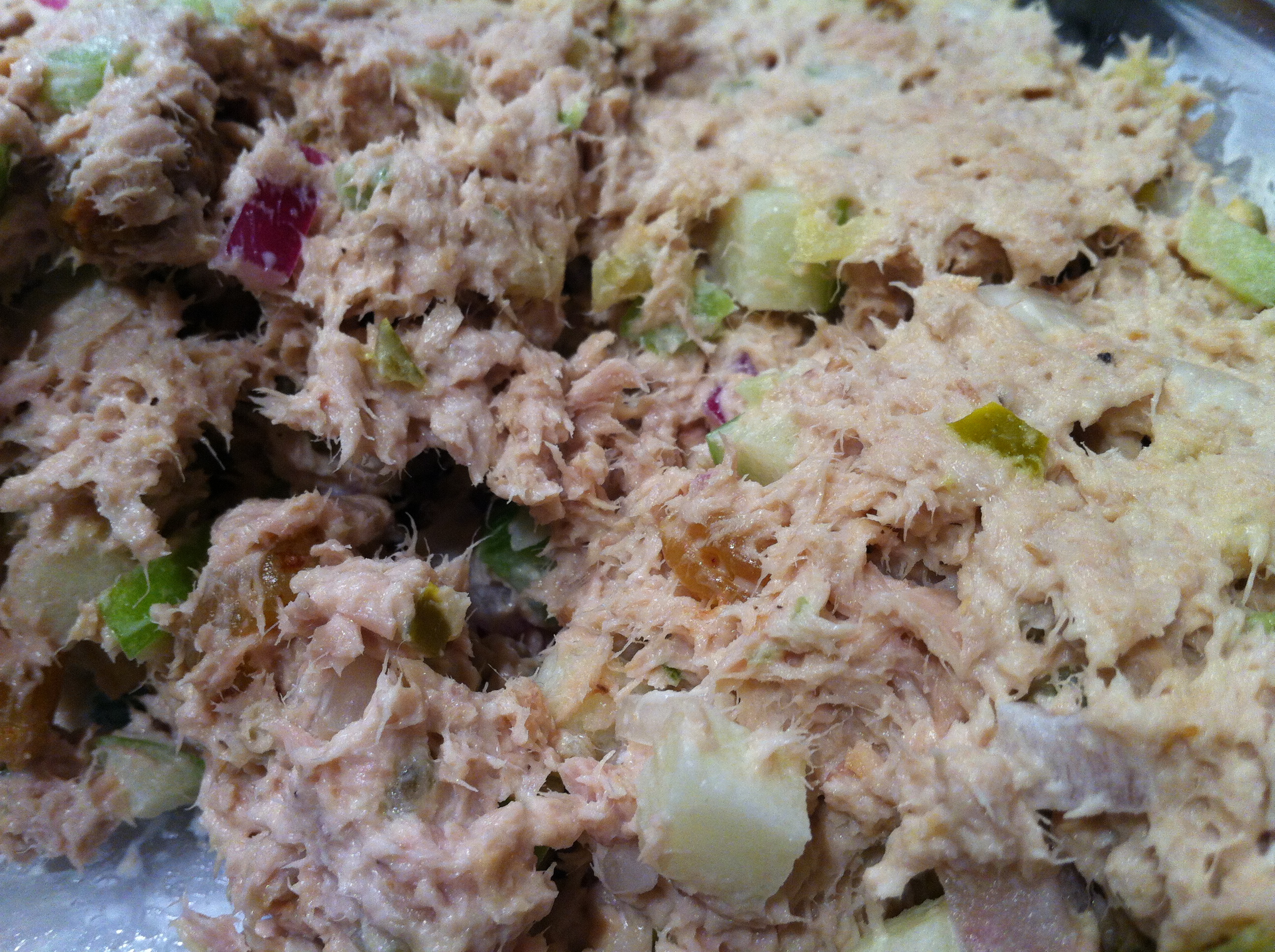 1- The trick to this tuna is drying out the tuna after you drain it. I dump it out into paper towels, then squeeze it. Then I squeeze it again through my hands. I dump the now-dry tuna into a medium sized bowl. Everything else goes into the bowl too. Then mix it up and serve. I think it tastes better if it has a chance to sit and meld a bit, but feel free to eat it with a spoon straight outta the bowl.