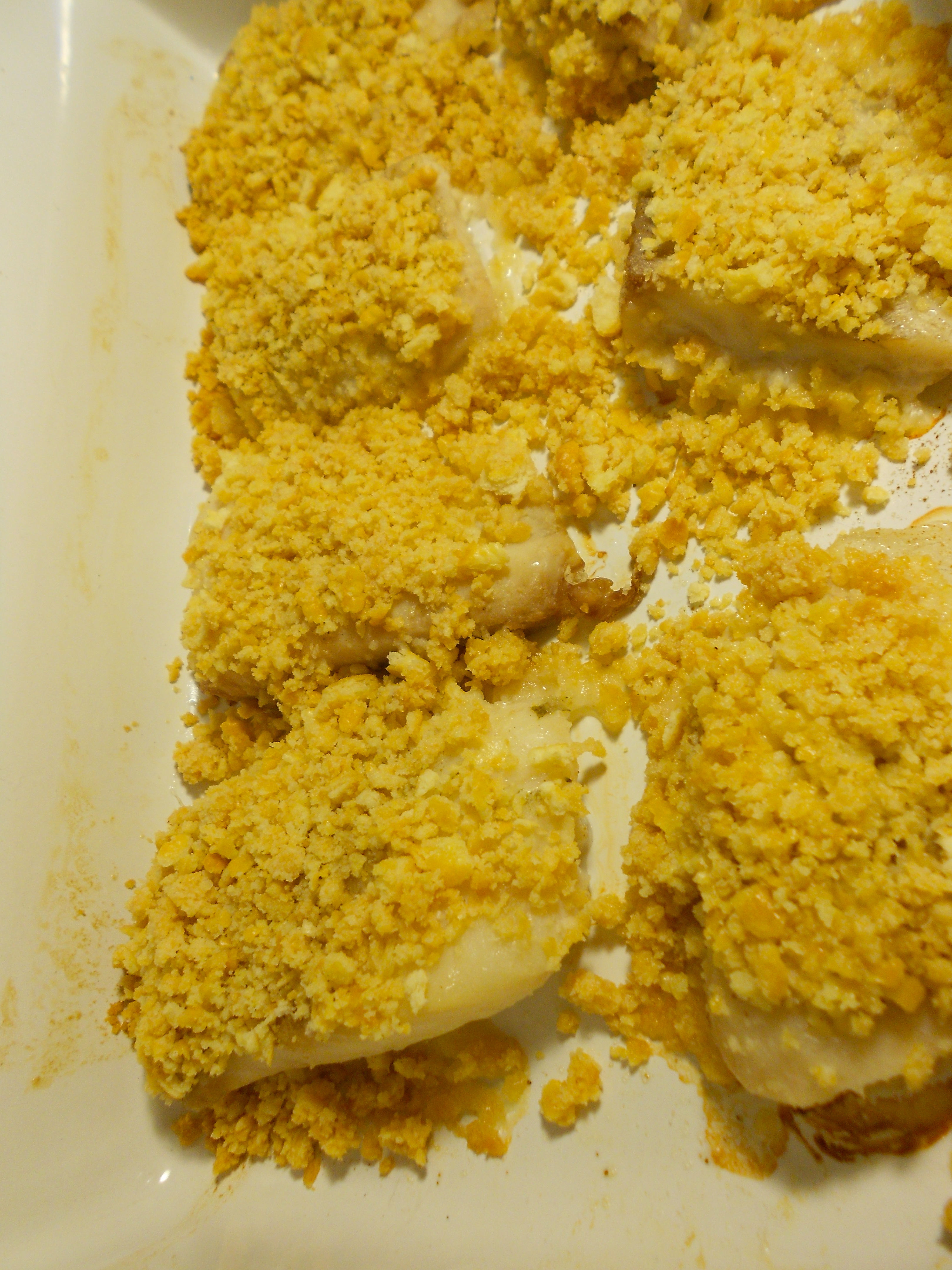 The fish was easy-peasy-puddin’-pie to make. Seriously easy and fast. I crumbled up a sleeve of Ritz (by crumbling I mean I dumped into a ziploc and whacked several times with my rolling pin) and melted 1/2 a stick of butter. I stirred them together. I rinsed and dried the fish, laid them out in a buttered dish, patted the cracker/butter mix on top and threw them into a hot oven for 20-25 minutes (I separated the thin and thick pieces onto 2 pans, so I could put the thinner pieces in 5 minutes later). Almost everyone at the table enjoyed the fish. C & I both had seconds.