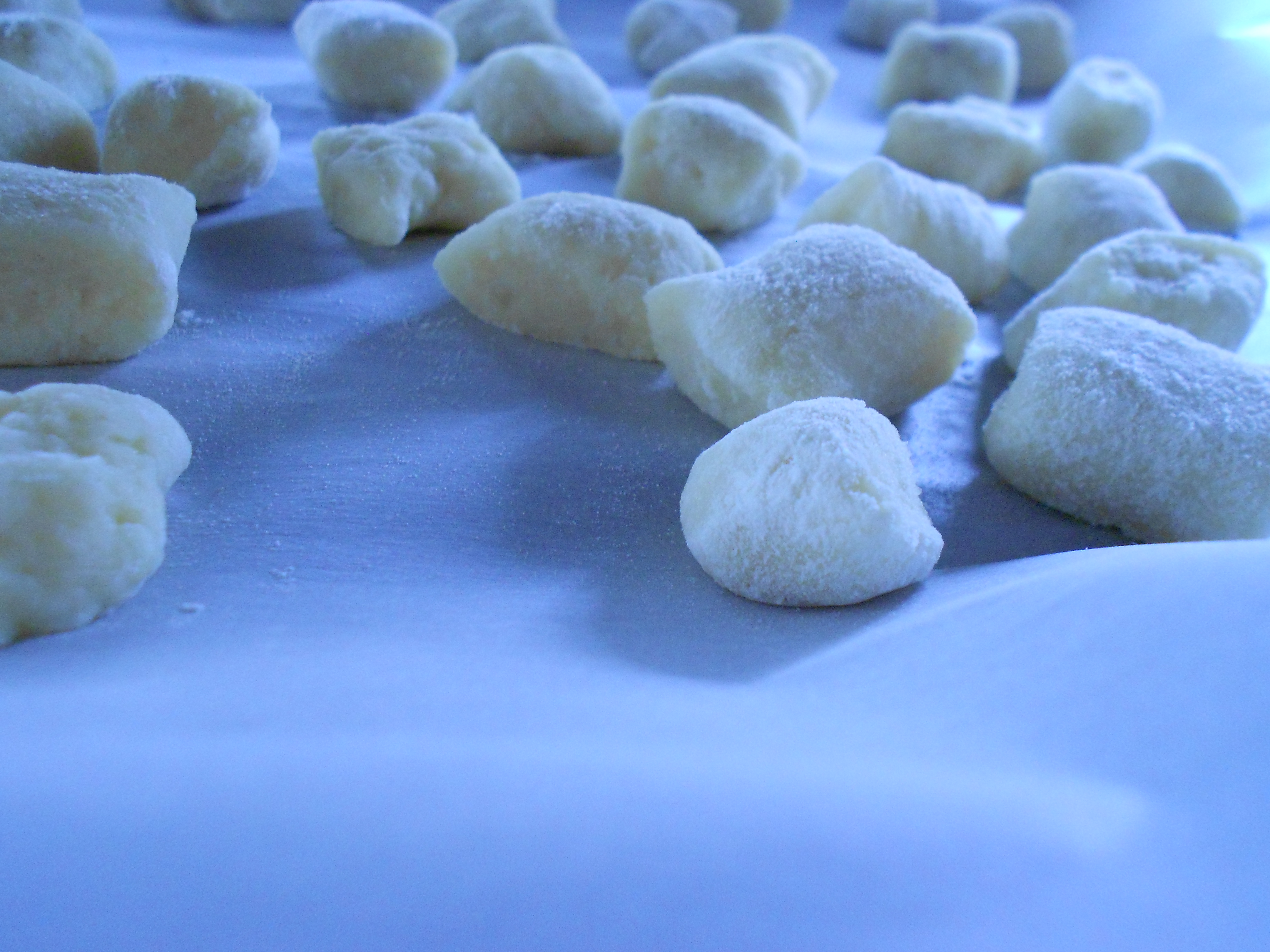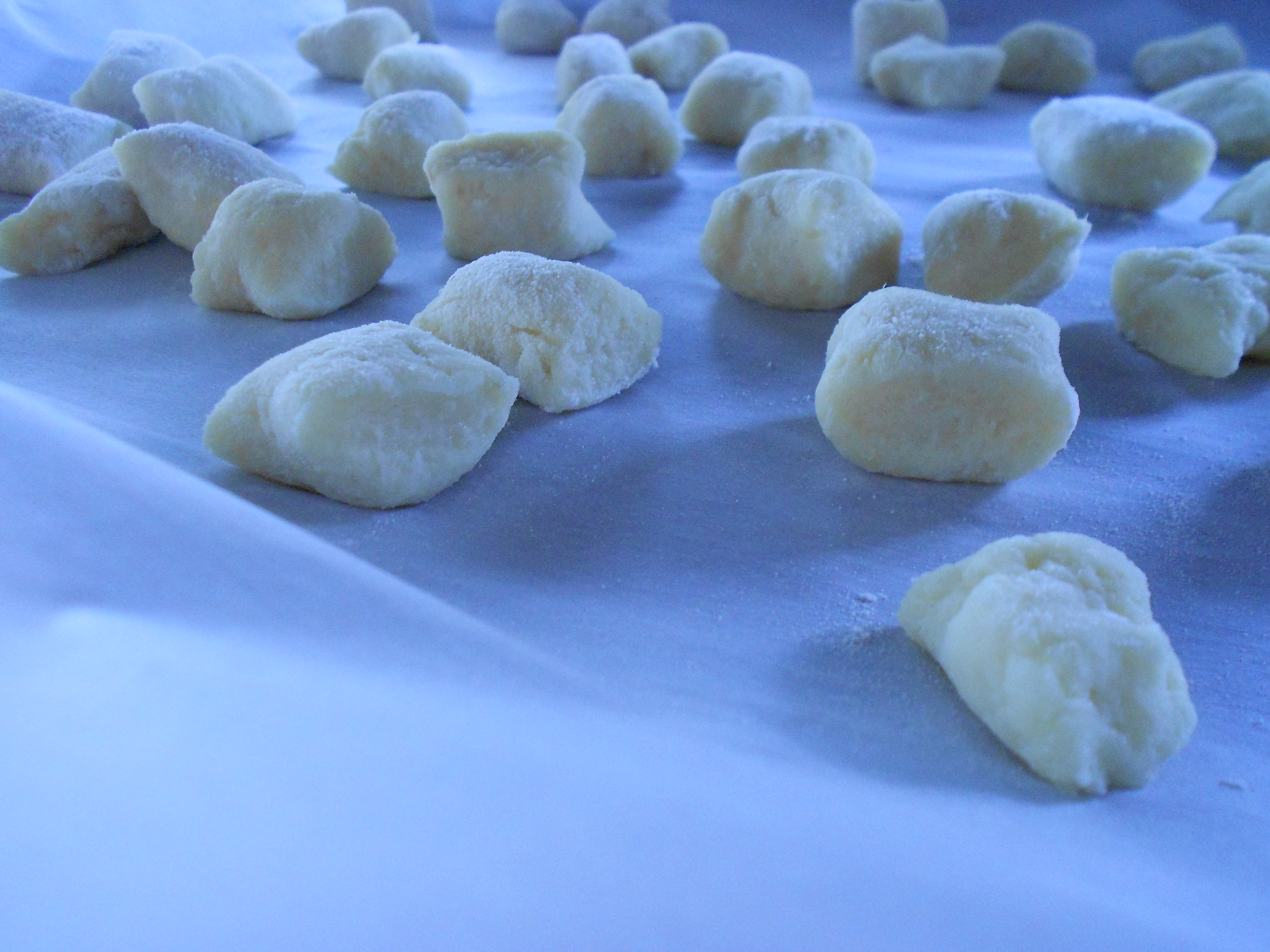 [Do ahead: If you’d like to freeze gnocchi for later user, do so on this tray. Once they are frozen, drop them into a freezer bag until needed. No need to defrost before cooking them; it will just take a minute or two longer.] **Alternately, I just left the gnocchi on the baking sheet all day until I made them for dinner.