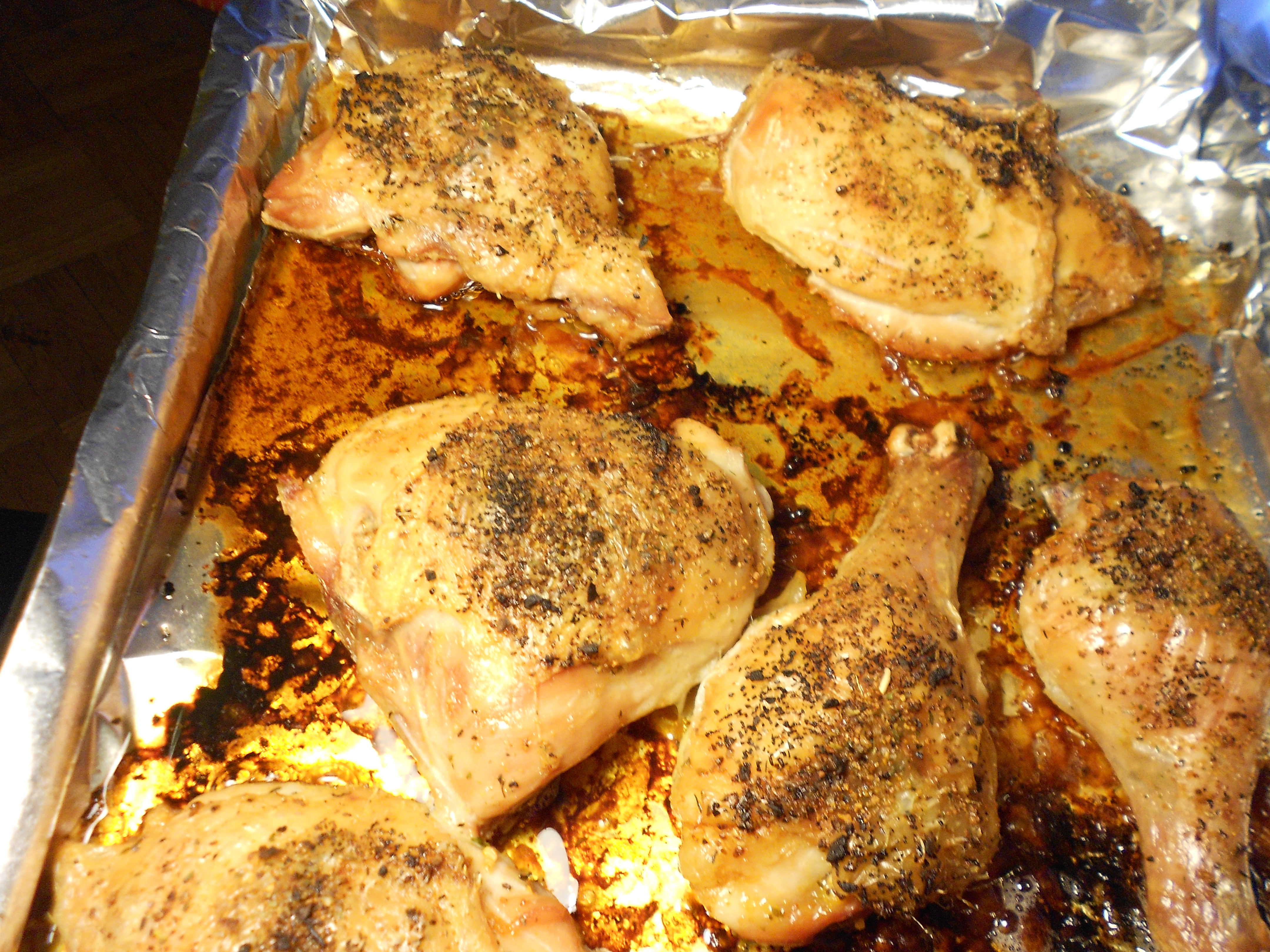 So you sprinkle some of the seasoning on the meat itself under the skin, then you lay the skin back and sprinkle another 1/4 teaspoon or so on top of the skin. Do this for all the pieces of the chicken.