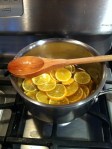 So I decided to candy my de-seeded jalapeños the same way I candy my citrus: sliced thinly and simmered in a simple syrup for about an hour and a half. I had a saucepan of each bubbling away on the stove last night.