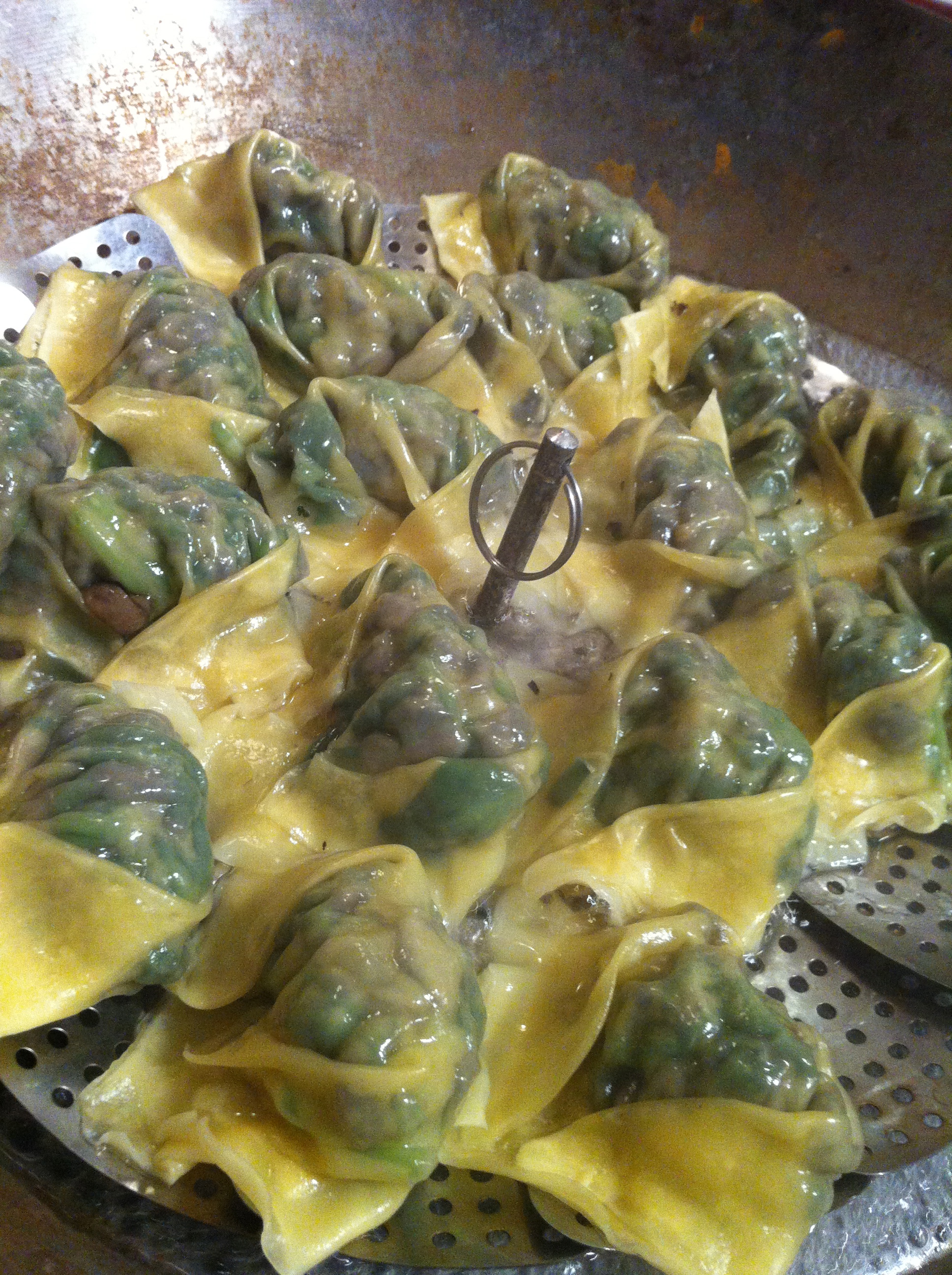 It was my first time steaming potstickers. I threw my old metal, hinged steam basket into my wok, like I’d seen on TV – the potstickers stuck to it. Next time I’ll try using parchment paper to line the bottom, like they do in the restaurants…or maybe I’ll invest in a real live bamboo steamer basket…That’d be fun. *Now thinking about where I’d store it.*