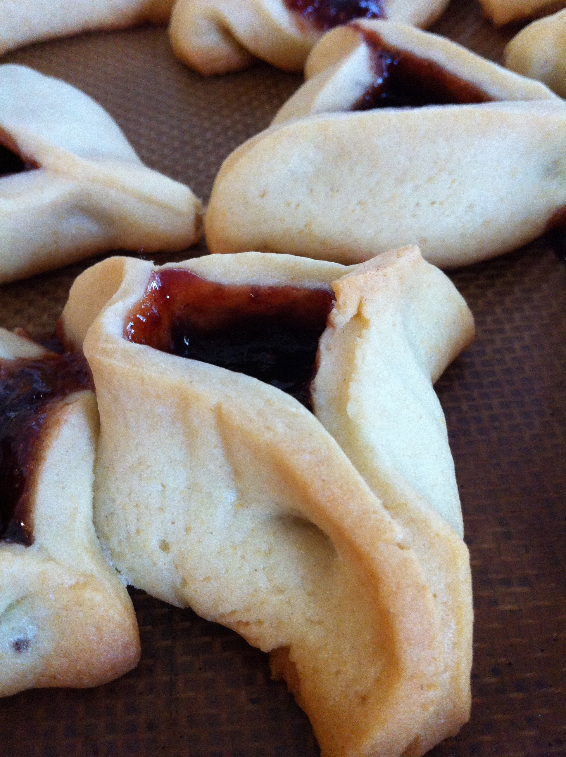 This morning I – for whatever reason – decided that the babies needed to help Mommy bake Hamantashen. We filled them with Peach Preserves, Raspberry-Pomegranate Jam, Strawberry Jelly and the very very end of that bag of Dove Chocolate Mini’s C’s been hoarding in the freezer since July.