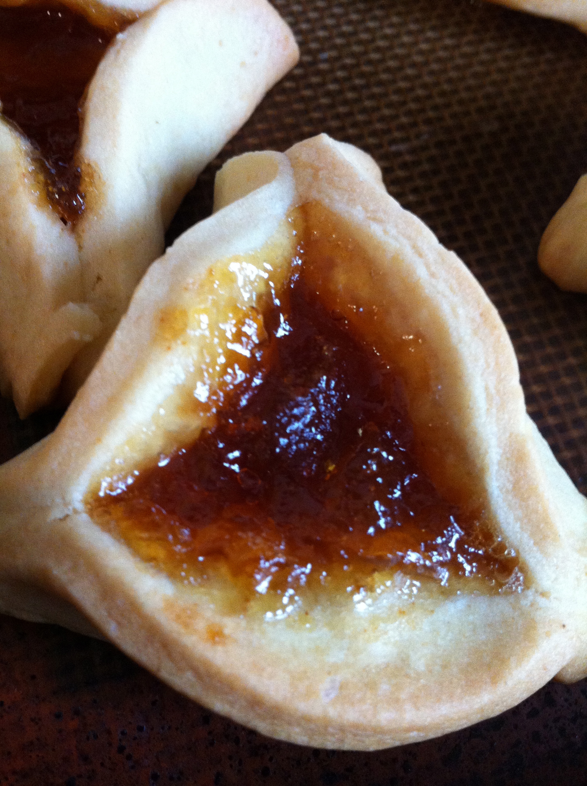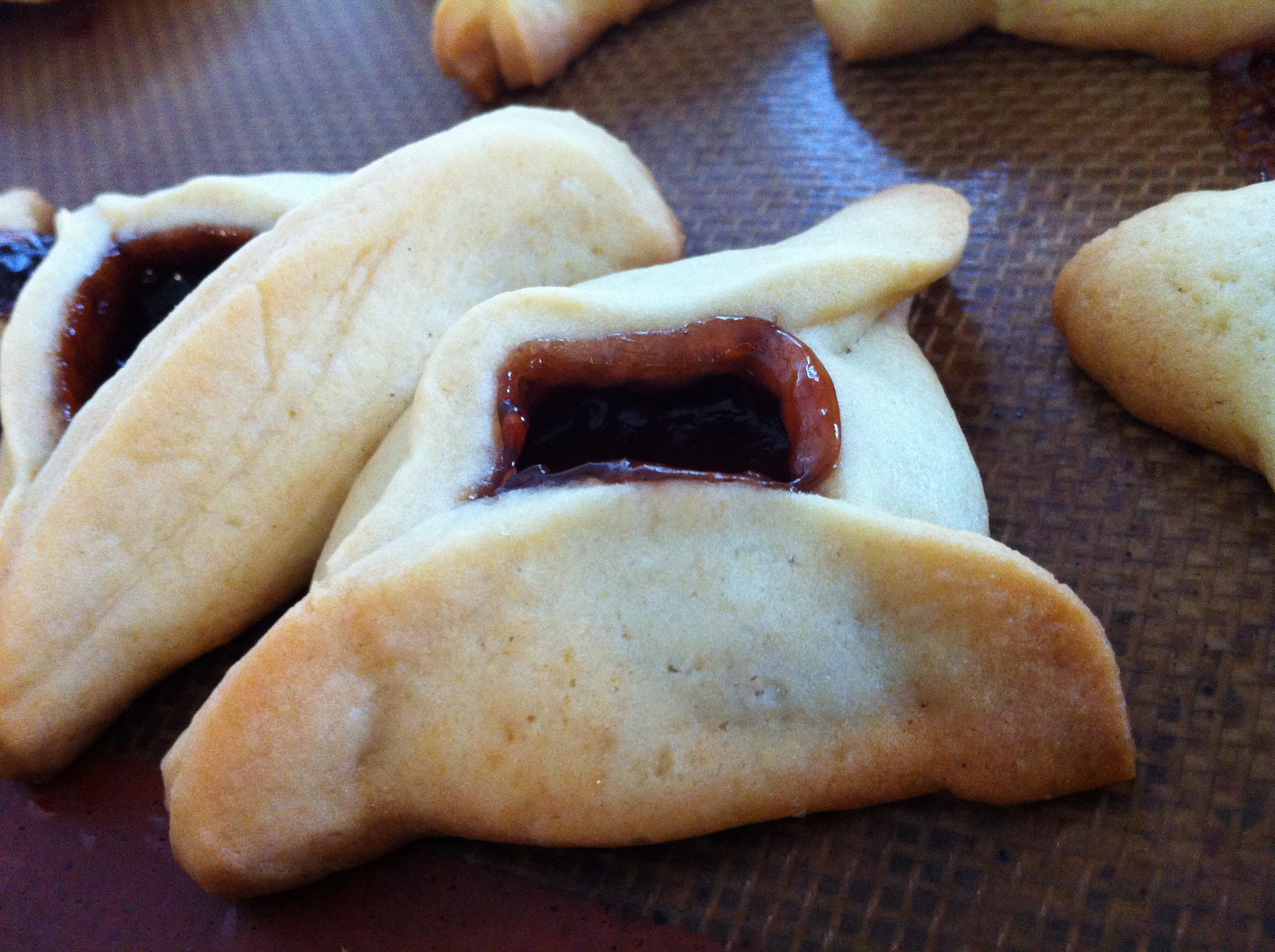 We eat a special triangular cookie called a Hamantaschen (sometimes spelled Hamantashen). It’s a sweet dough that’s cut out into circles, filled with jam or nuts or chocolate or whatever you really feel like using, then pinched into triangles and baked.