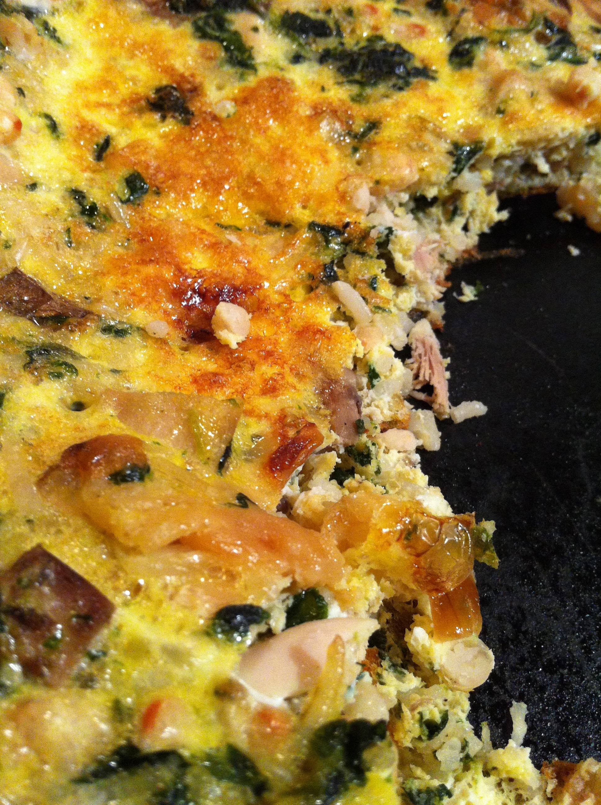 Tonight I made a Frittata. I think everyone makes some version of Leftover Surprise. Some people mix leftovers into bread dough and bake it. Some mix all their fridge findings into mashed potatoes. Others turn their bits and pieces into a Pasta Bake.