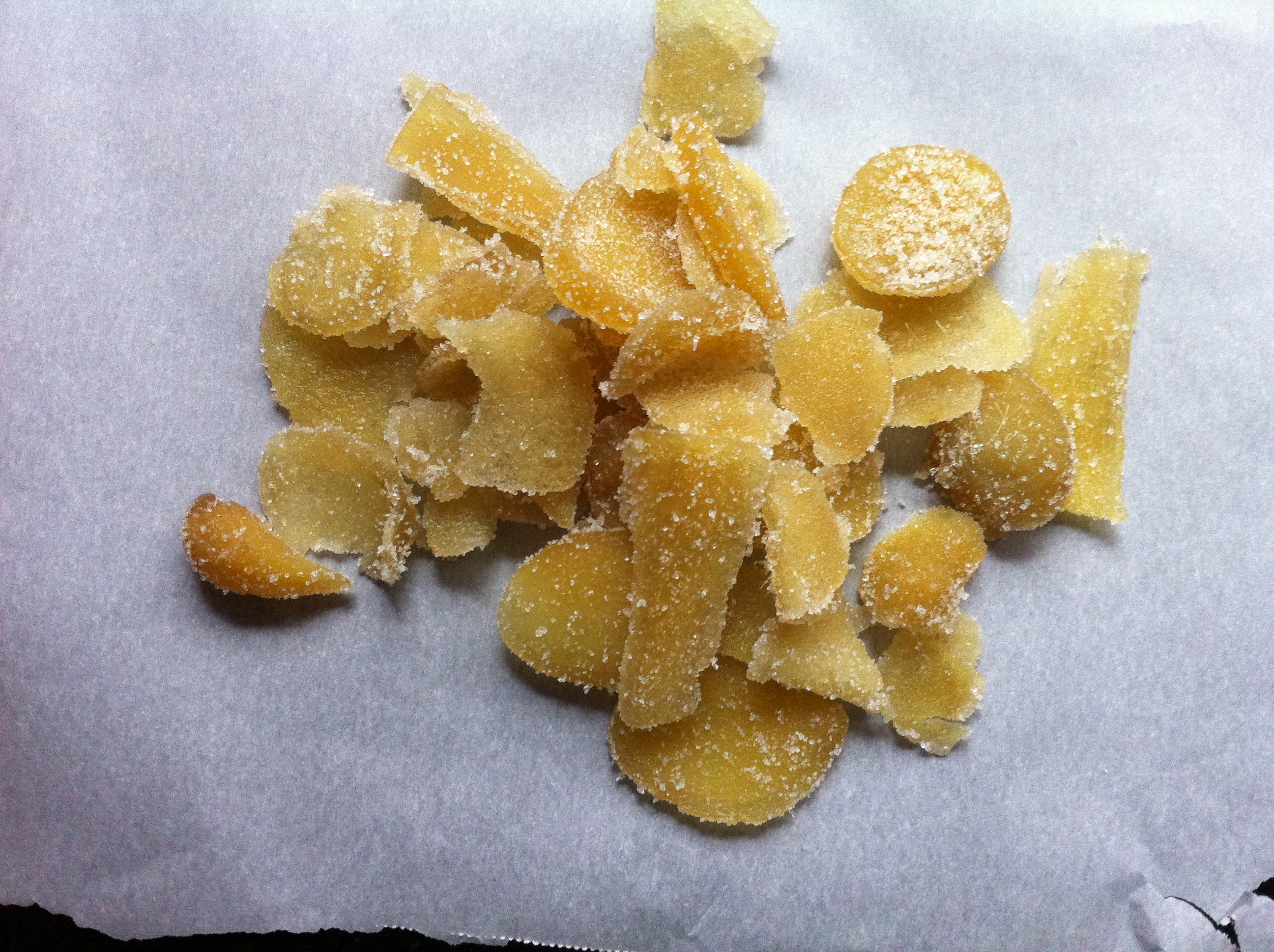So he made candied ginger and so we did to. C was in charge of the washing and slicing – well he was until he sliced his thumb open. THAT wasn’t fun. So after much washing and cleaning and band-aiding, I took over. We finished and simmered the ginger slivers in a simple syrup and then laid them out to dry overnight. This morning I rolled the said slivers in white sugar and took some lovely photos. Well, I think they’re lovely.