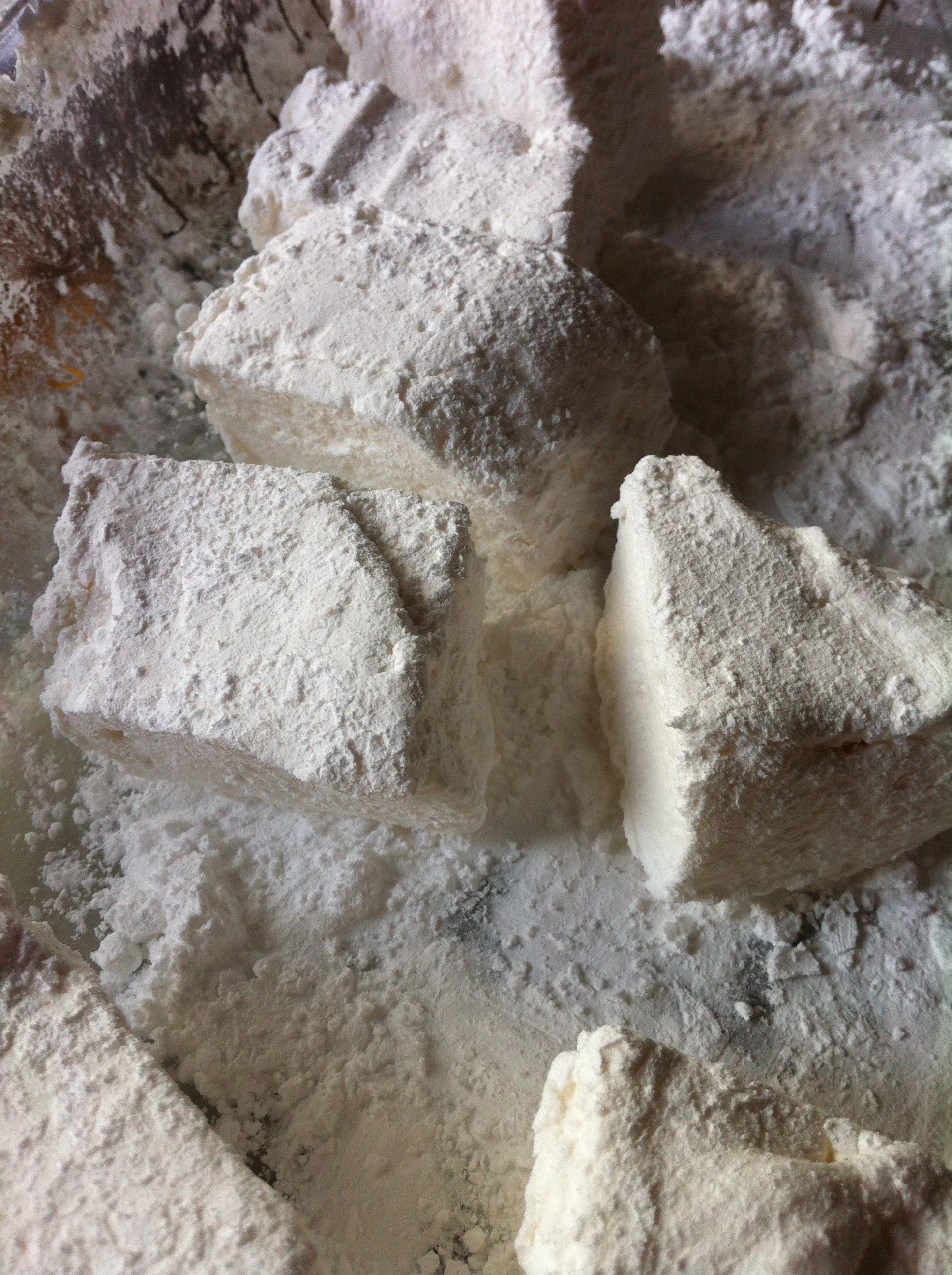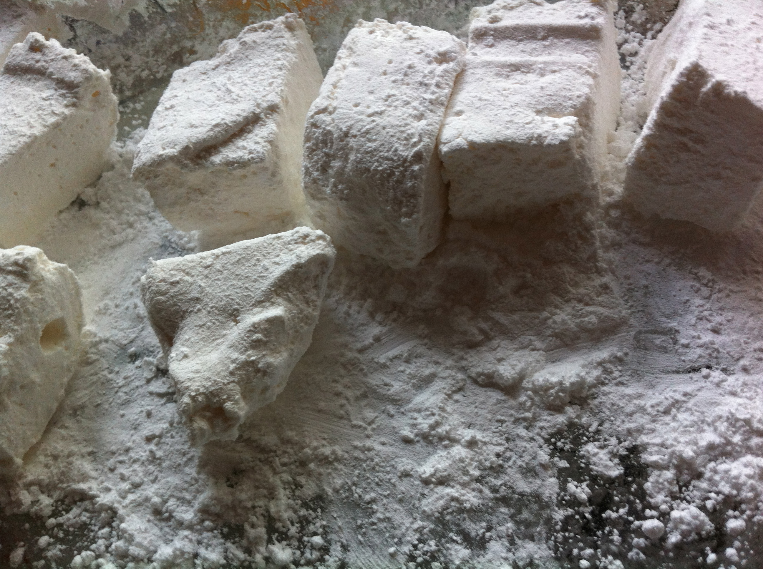 12- Run a thin knife around the edge of the pan and invert onto a large cutting board. Lifting up one corner of the upside-down pan, use your fingers to loosen the marshmallows and ease them onto the cutting board. With a large knife (or oiled pizza cutter) trim the edges and then cut marshmallows into roughly one-inch cubes. Sift the remaining confectioners’ sugar back into your now-empty baking pan, and roll the marshmallows through it, on all six sides, before shaking off the excess and packing them away.