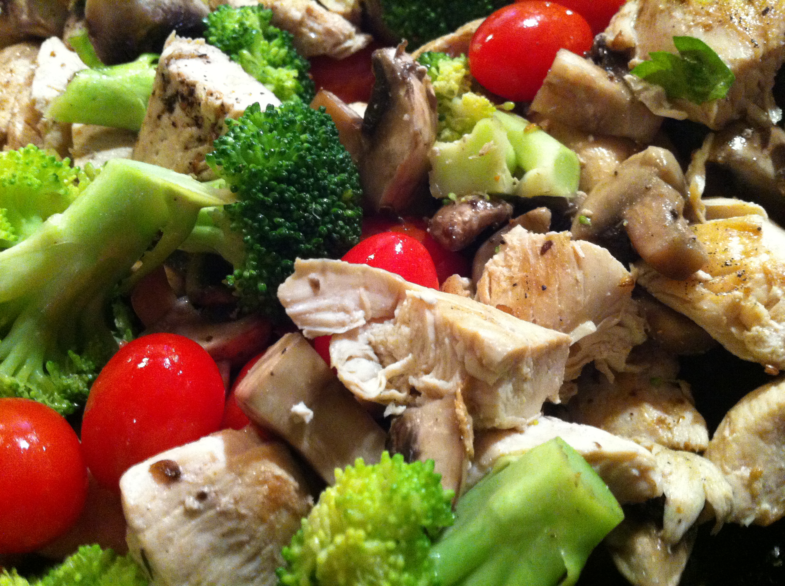 12- Add your veggie and chicken to the pasta and stir.