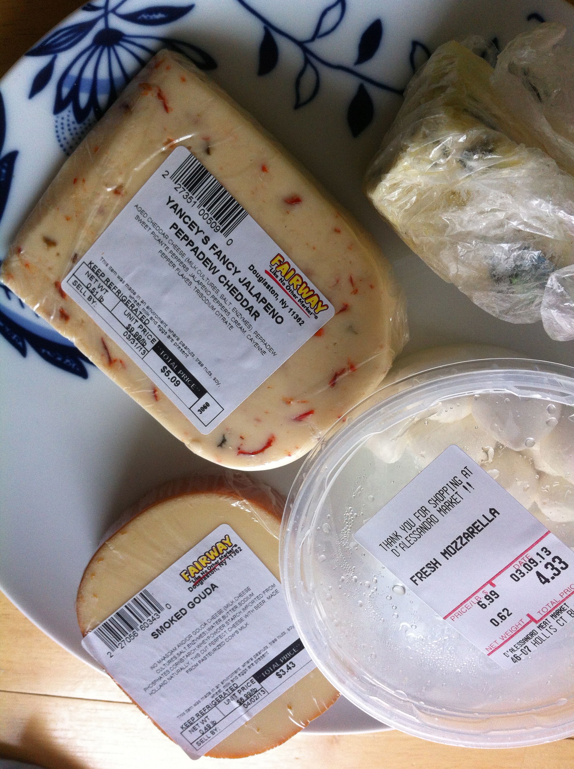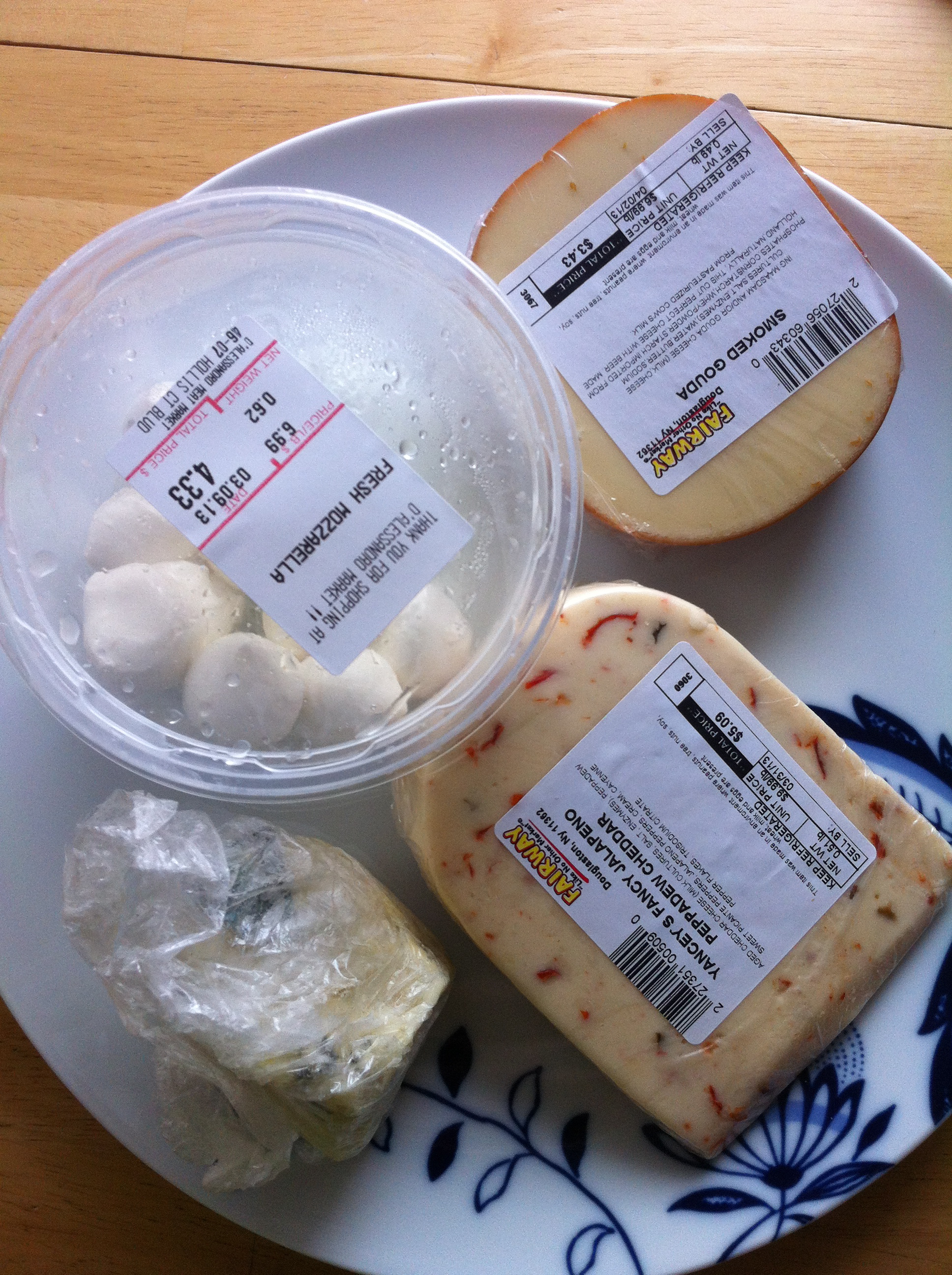 A Variety of Cheeses **Today we had Smoked Gouda, Mozzarella Balls, Blue Cheese (I think it was a domestic version of roquefort), and a Peppadew Pepper embedded Cheddar.