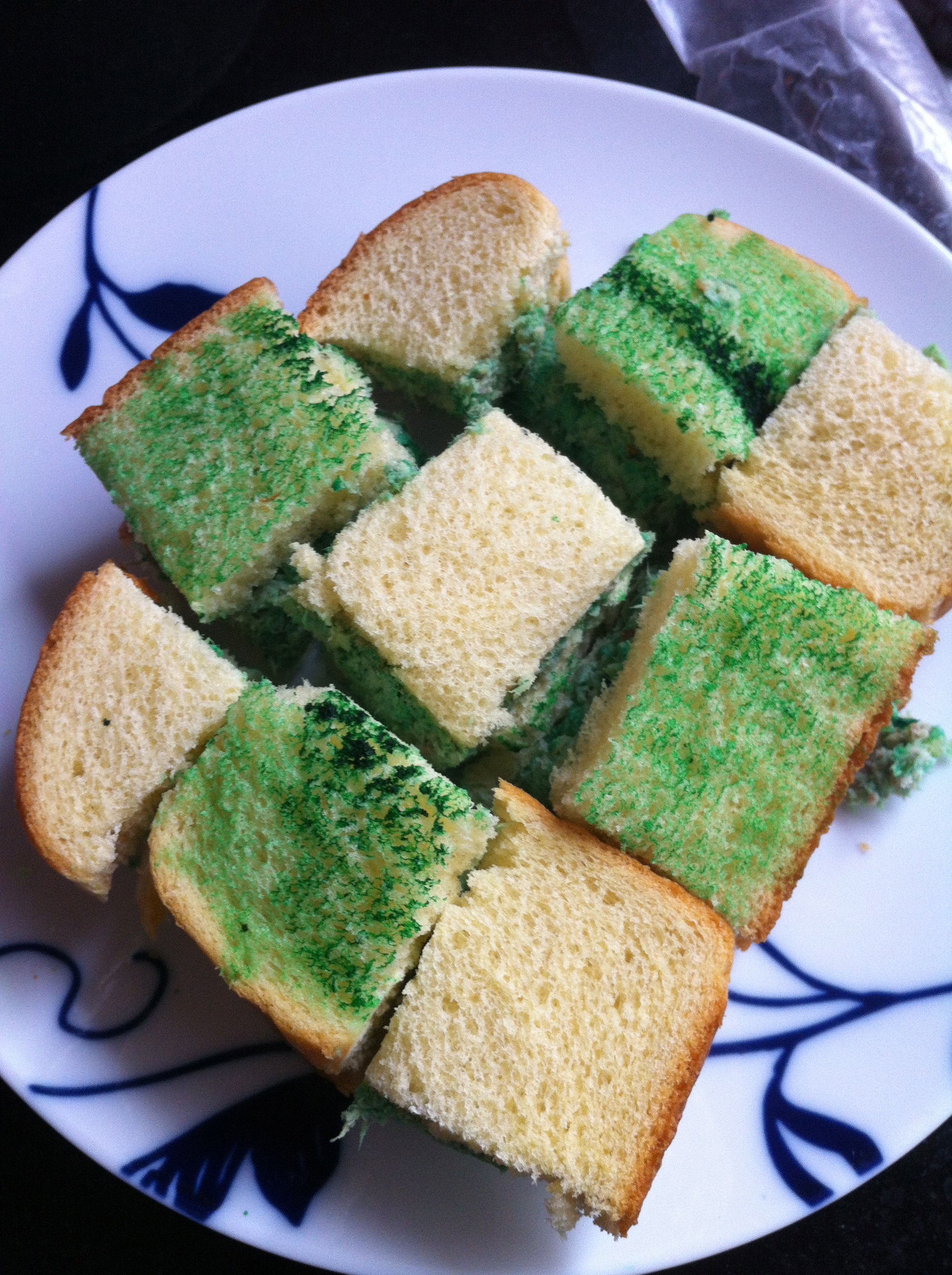 Today we’re gonna eat this on bread dyed with green food coloring too. I usually paint the food coloring on the slices of bread with a food safe paint brush (I bought mine at a crafts store). If you have a shpritzer available or wanna dip your bread in a shallow filled with food coloring, those are other ways to go about this. Then again, you could just make drop-colored bread or use the finger-painting method…. Up to you.