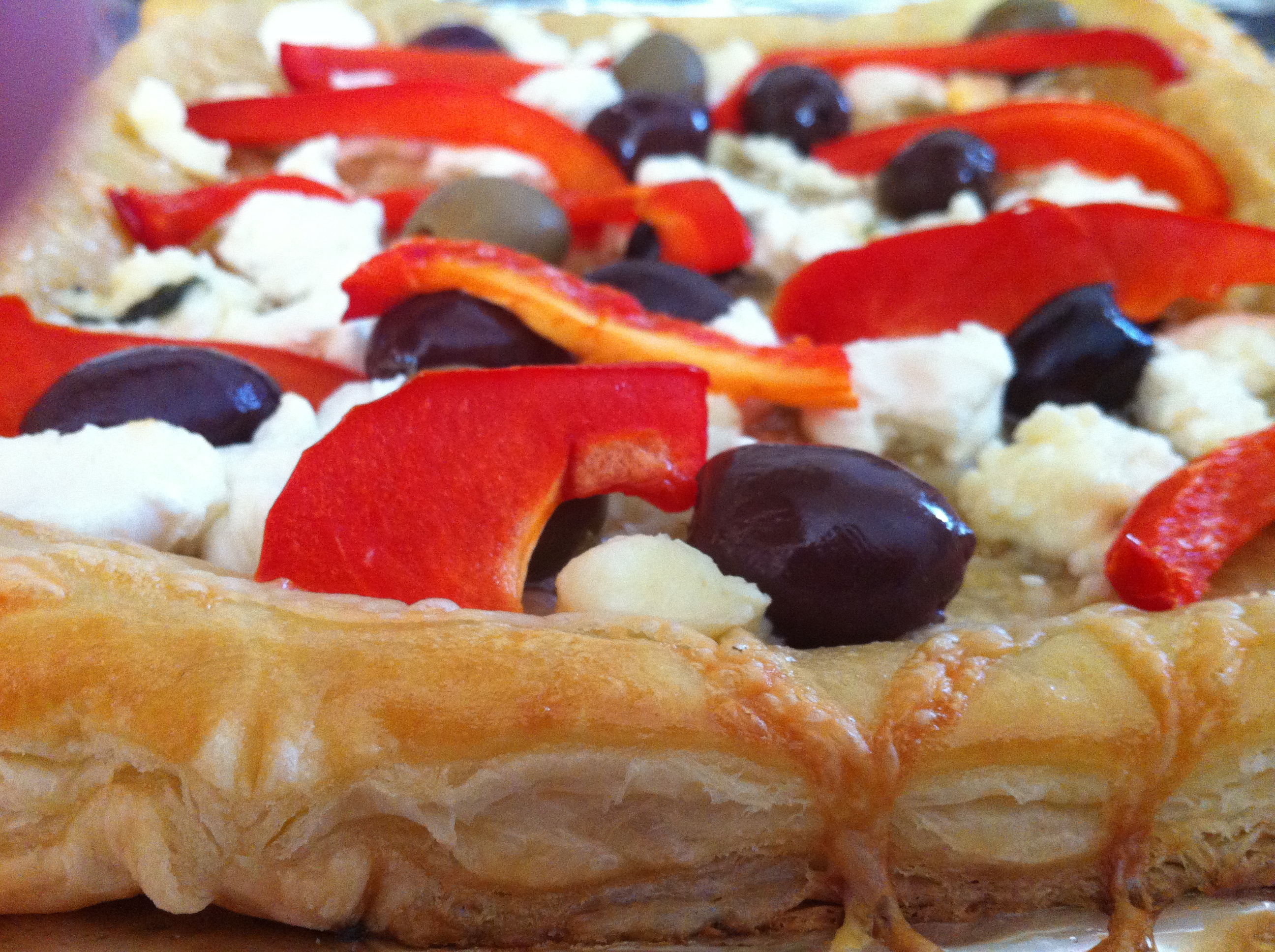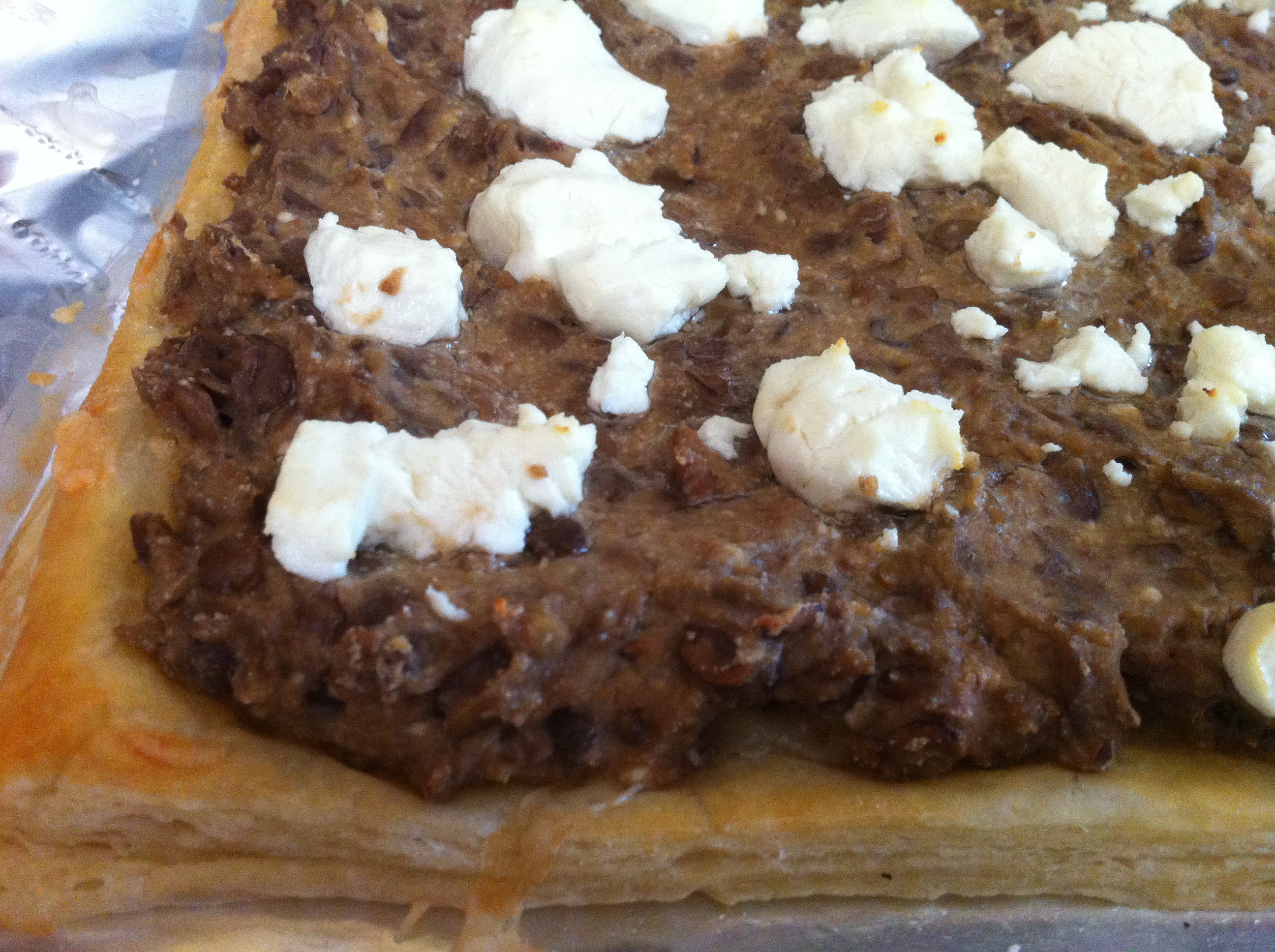 I had high hopes for the tarts. I took two sheets of puff pastry, laid them out, pricked them all over with a fork, brushed them ever so gently with some whisked egg, grated 1/2 cup of Gruyere over the top of each and gently placed these babies in a 400°F oven. 12 minutes later I removed these puffy little treats and allowed them to cool. One I topped with a mix of lentils and ricotta, then broke up 1/3 cup of goat cheese and sprinkled that liberally over the top – it sounded like a good idea at the time. The other tart also got 1/3 cup of goat cheese, along with 1/4 cup of crumbled gorgonzola, a dozen olives (I left them whole) and half of a thinly sliced fresh red pepper.