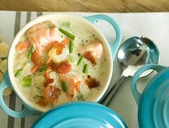 So WholeFoods has a super-duper easy Salmon Chowder recipe on hand. No flour, no corn-starch – PERFECT!